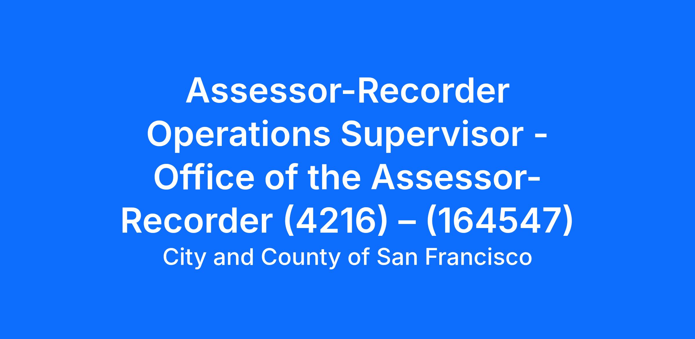 The Office of the Assessor-Recorder currently has a full-time vacancy in class 4216 Assessor-Recorder Operations Supervisor. Under general direction, the 4216 Assessor-Recorder Operations Supervisor is responsible for difficult, specialized and technical office support and customer service work within the Office of the Assessor-Recorder, including serving as a primary public contact person to explain important and specialized policies, procedures, and regulations. This is the supervisory level in the Assessor-Recorder Office clerical series. This is a full in-person role with the potential for up to one (1) remote workday per week upon successful completion of the probationary period.