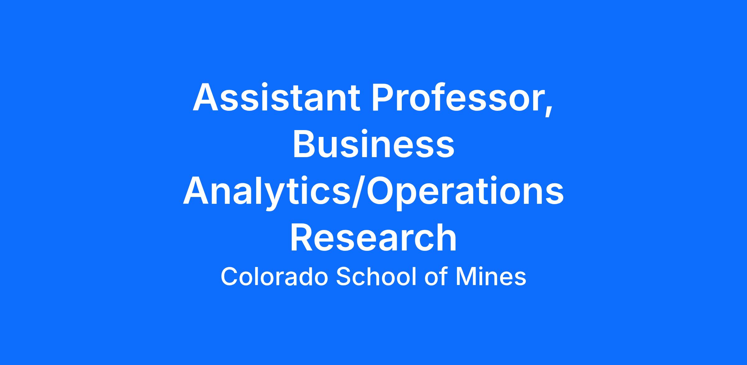 The Department of Economics and Business at the Colorado School of Mines (Mines) invites applications for a tenure-track Assistant Professor position in Business Analytics/Operations Research. The primary focus of this position will be to help develop and support the quantitative business programs on campus and to contribute to interdisciplinary research in Mines’ focus areas. We are open to all areas, but we are especially interested in candidates with expertise in supply chain, simulation, and optimization under uncertainty.Business analytics, operations research, and associated courses are taught in several programs at Mines. In the Department of Economics and Business, these programs include the Engineering and Technology Management MS degree, the Mineral and Energy Economics MS and PhD program, the Business Engineering and Management Science BS degree, and the online Business Analytics certificate. Business analytics courses also support the interdisciplinary Operations Research with Engineering MS and PhD program and the Data Science MS degree.