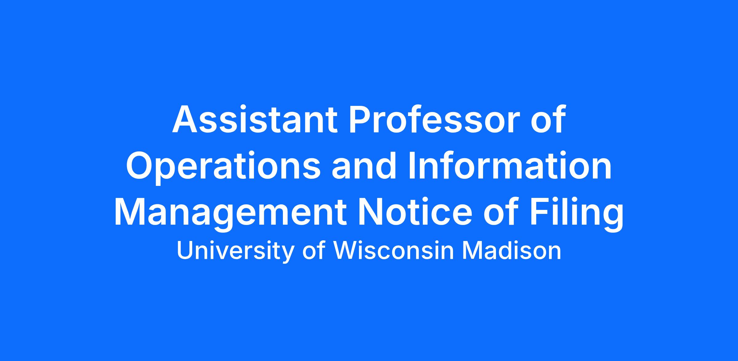 The Department of Operations and Information Management (OIM) at the Wisconsin School of Business invites applications for an Assistant Professor position to start in August 2026. We are especially interested in applications from candidates whose research tackles critical sustainability issues in supply chain management.