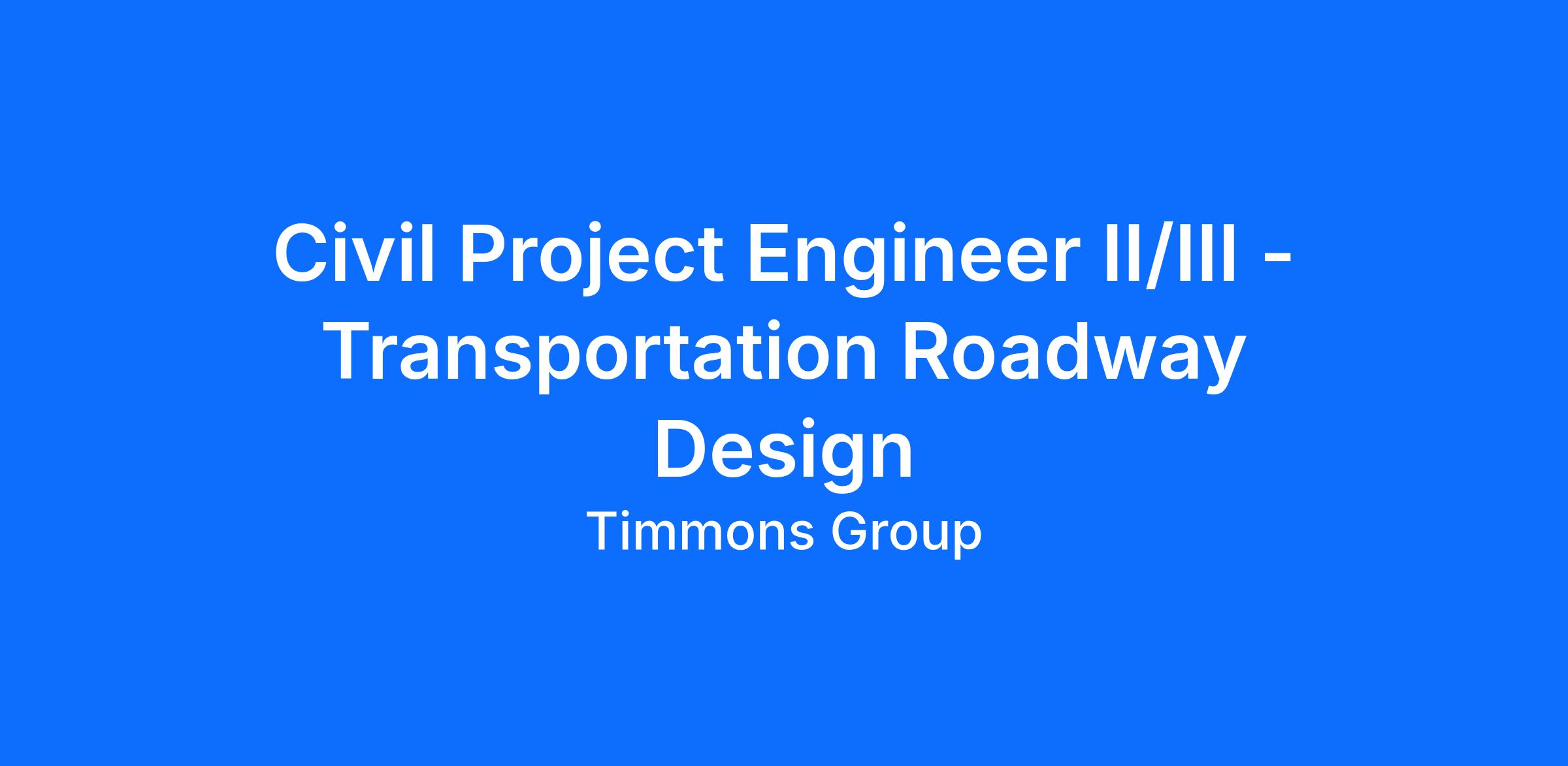 Timmons Group is currently seeking a Civil Project Engineer II/III to join our Roadway Design Transportation Group in our Virginia Beach, VA office. This is an exciting opportunity to work on impactful transportation projects and grow your career with a collaborative and innovative team.