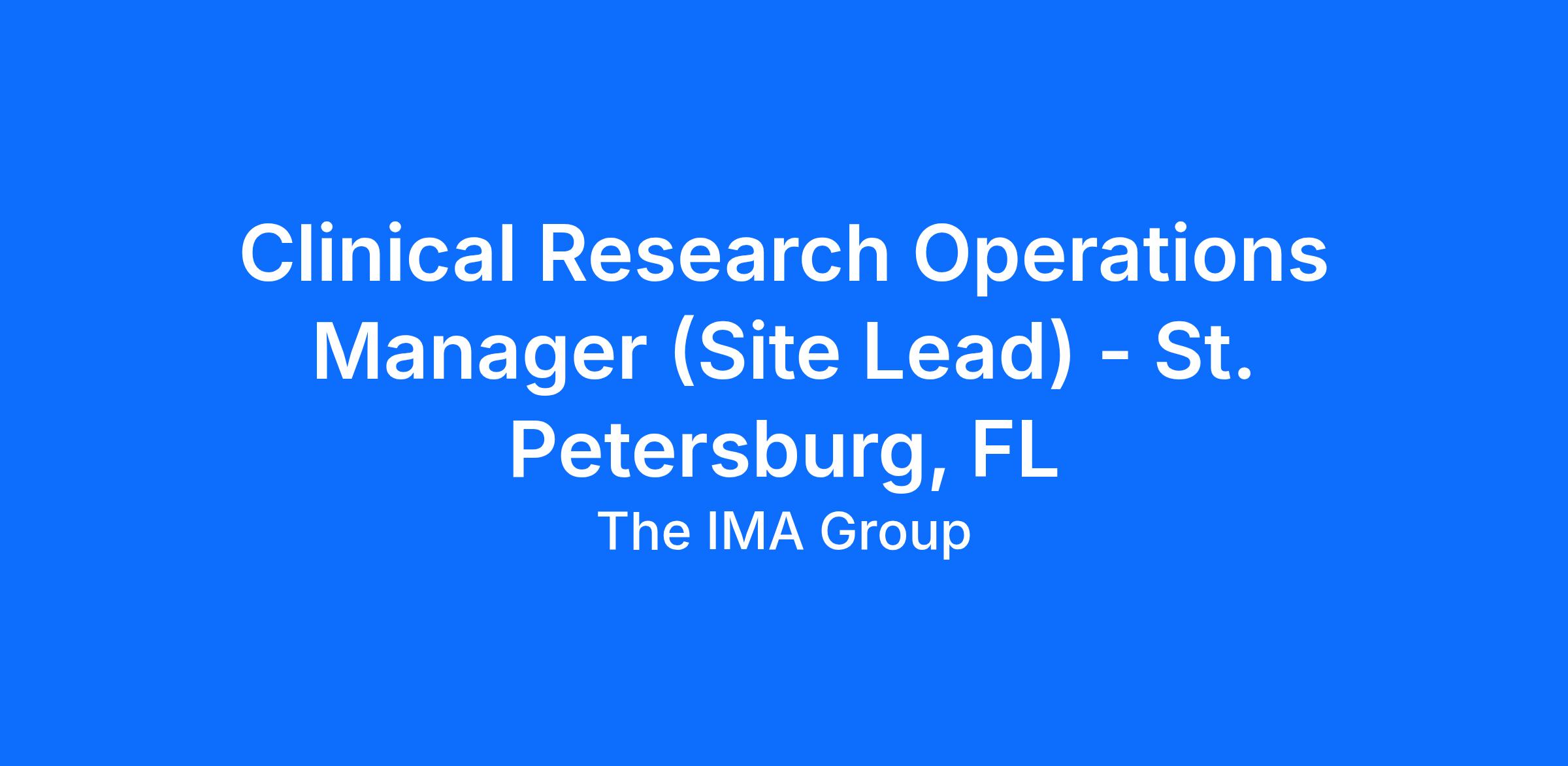 IMA Clinical Research is seeking a Site Manager to lead daily operations at our St. Petersburg site. This role oversees study execution, staff performance, and regulatory compliance while partnering with leadership to drive high-quality research outcomes.