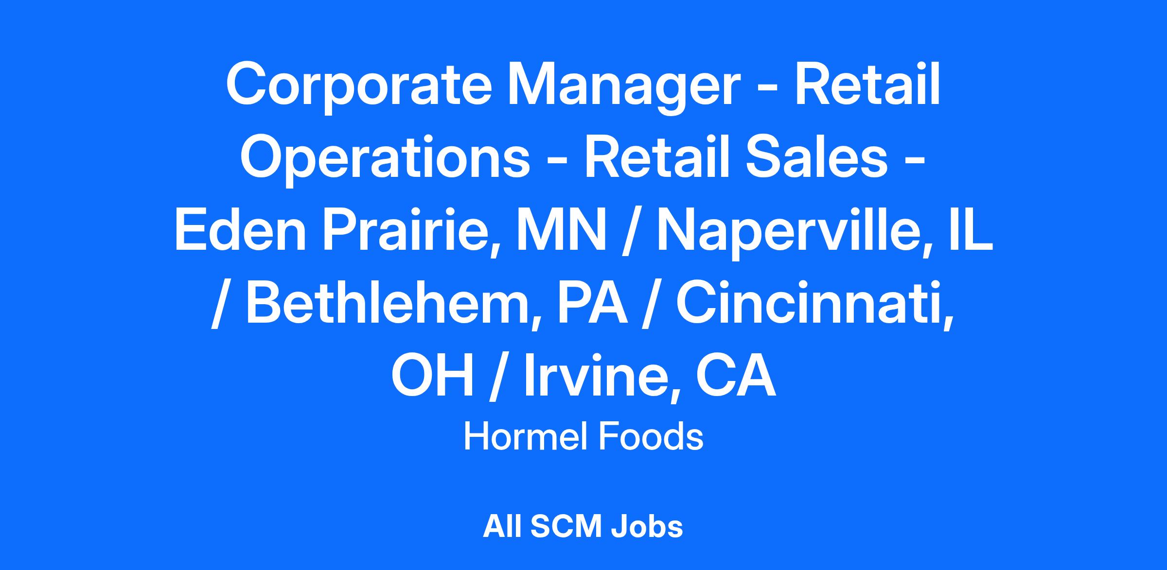 CORPORATE MANAGER OF RETAIL OPERATIONS – RETAIL SALES – EDEN PRAIRIE, MN / NAPERVILLE, IL / BETHLEHEM, PA / CINCINNATI, OH / IRVINE, CA