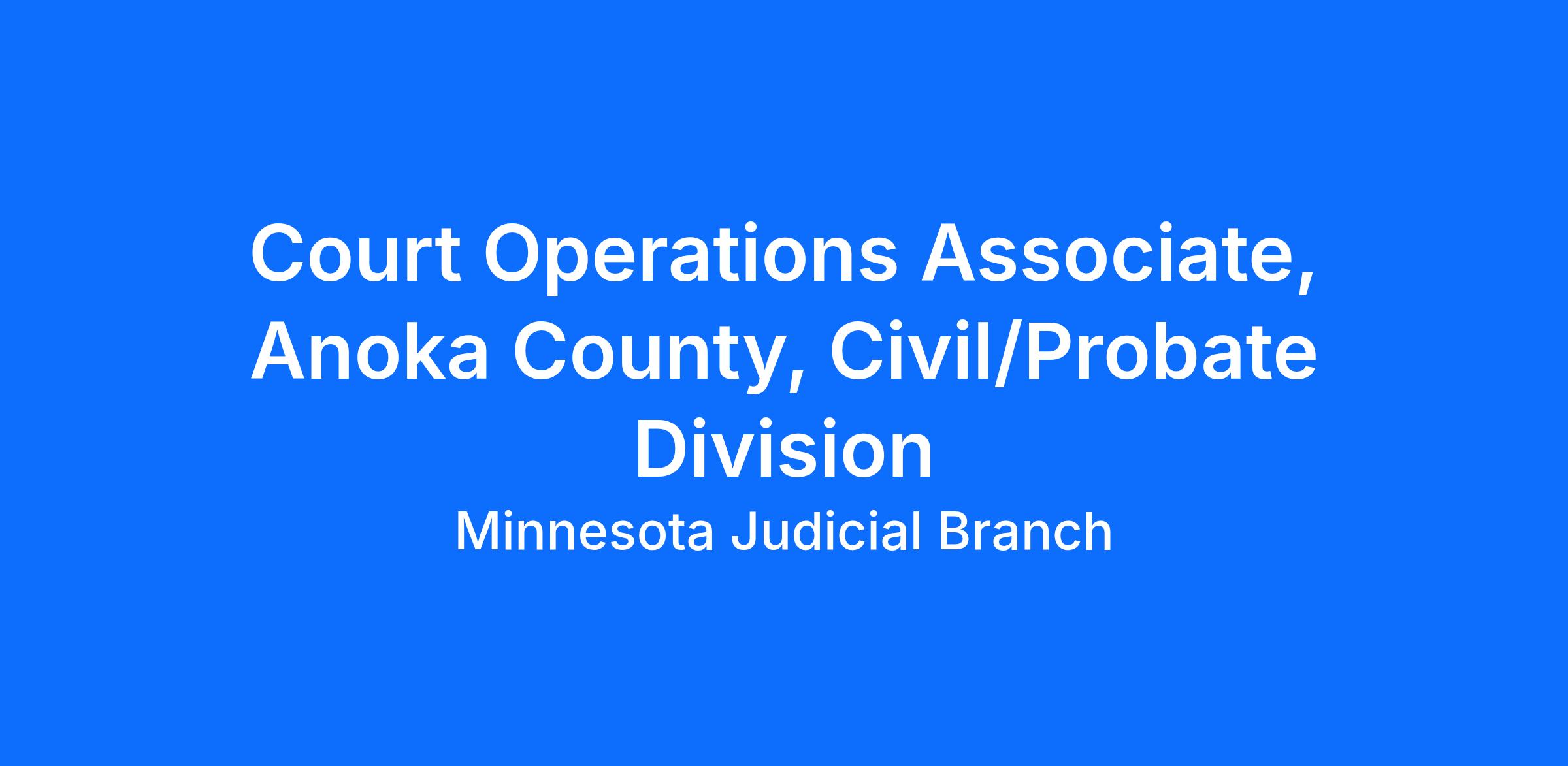 Anoka County District Court has an amazing opportunity to join the Civil/Probate Team as a Court Operations Associate in a diverse professional environment, that promotes equity for all court staff and court users. This is an entry-level position performing detail-oriented work while providing excellent customer service in the courtroom, public counters, and over the phone.
