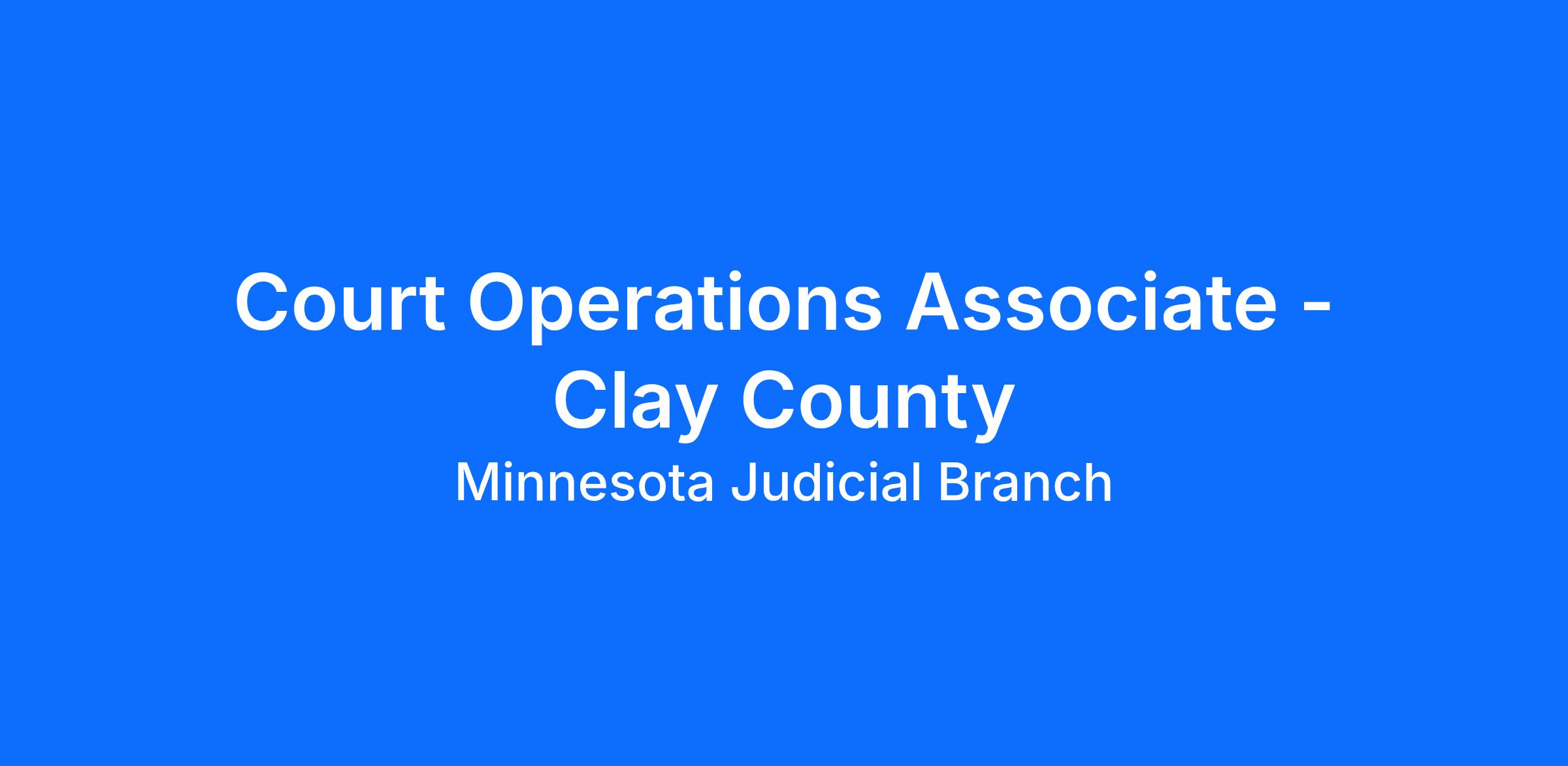DescriptionThe Seventh Judicial District invites qualified applicants to apply for one vacant Court Operations Associate position in Clay County Court Administration. The primary work location is in Clay County Court Administration in Moorhead, MN.