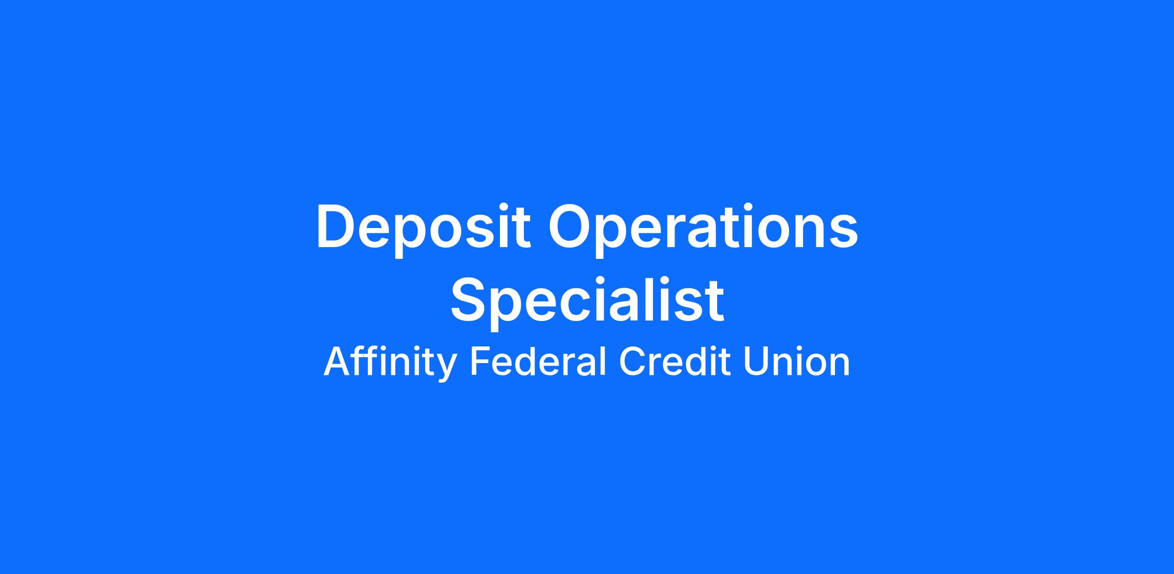Affinity FCU is seeking an engaged, eager individual to join our Deposit Operations team! The Deposit Operations Specialist is responsible for performing functions regarding Remote Deposits, mailed deposits and payments, deposit account verifications and write-offs, ensuring that processes are completed accurately and timely. The Deposit Operations Specialist interacts with members, businesses, third party vendors and frontline staff to provide a quality service experience.