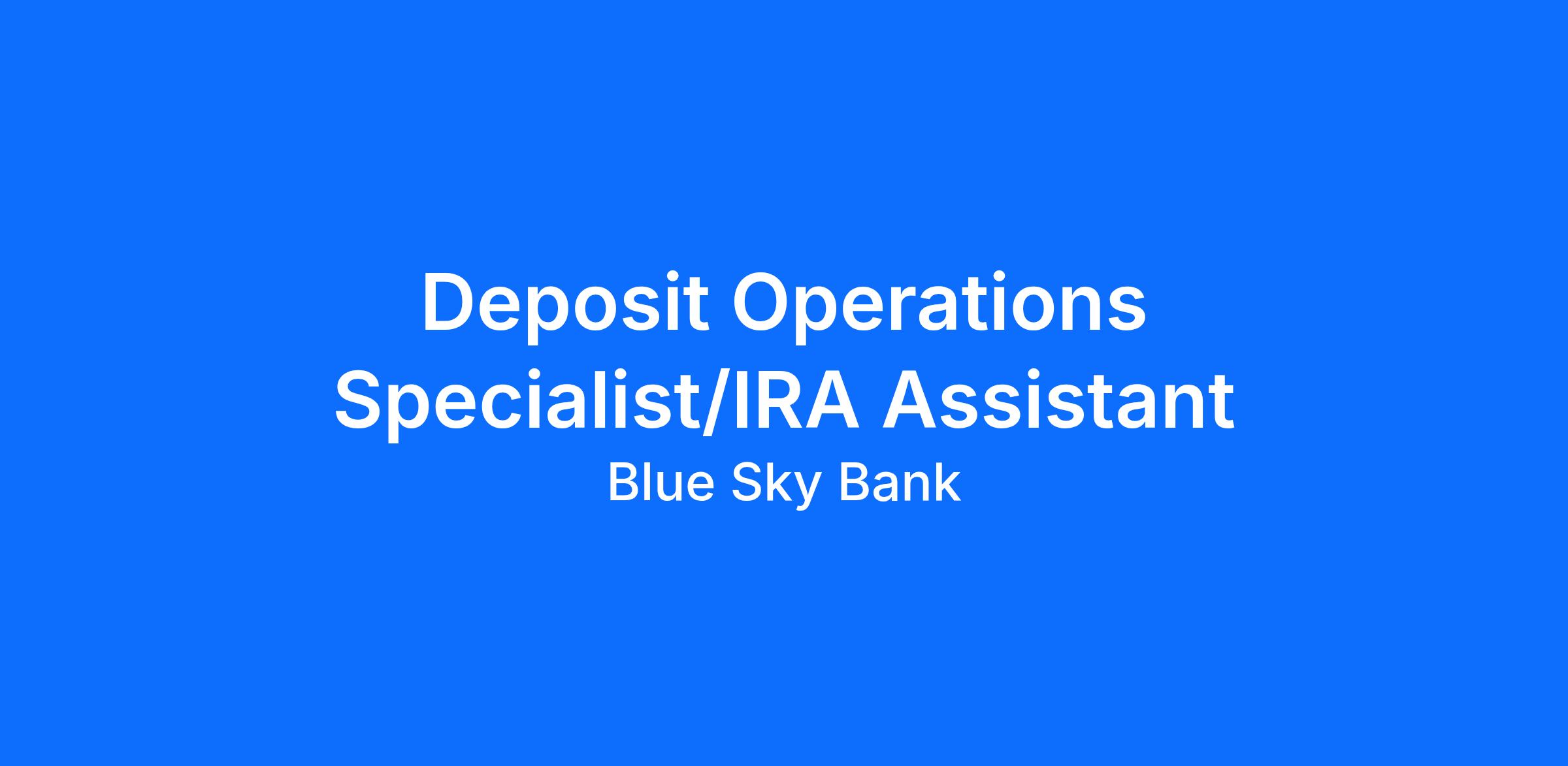 A Deposit Operations Specialist/IRA Assistant performs a wide variety of duties in the Deposit Operations Department to include various daily tasks related to the day-to-day operations of the Bank as well as handling functions that have a regulatory, monetary, and potential reputational risk impact. These tasks are time sensitive and must be adhered to as per all Bank policies and procedures.