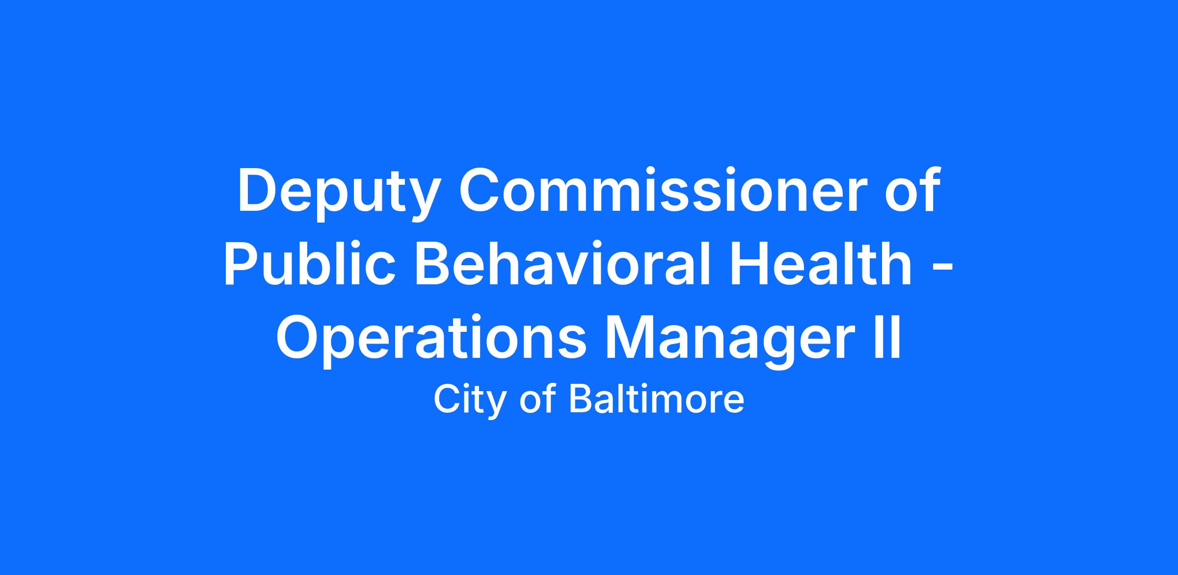 The Baltimore City Health Department (BCHD) is seeking a Deputy Commissioner to lead the newly organized Division of Public Behavioral Health. Founded in 1793, BCHD is the oldest health department in the country, with around 800 employees and an annual budget of around $200 million, that aims to protect health, eliminate disparities, and ensure the well-being of everyone in our community through education, advocacy, and direct service delivery. BCHD’s wide-ranging responsibilities include maternal and child health, youth wellness, school health, aging services, animal control, restaurant inspections, violence prevention, emergency preparedness, STI/HIV treatment, and acute and chronic disease prevention. This senior management position will lead a talented team responsible for the public health vision and strategy for preventing and addressing challenges related to mental health and substance use in Baltimore City.