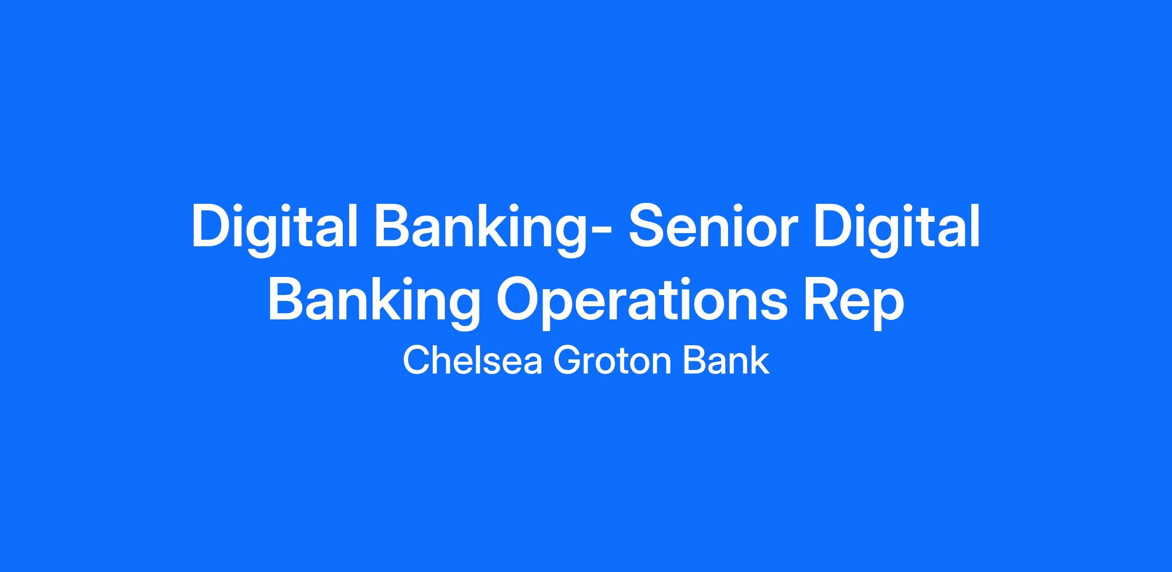 Chelsea Groton is looking to hire a motivated and dynamic individual for our Digital Banking Department. The Senior Digital Banking Operations Representative assists our customers by phone, video, and on-site at business locations. The ideal candidate will be a motivated and personable individual who provides outstanding service in a professional manner with strong attention to detail and time management skills. Become a member of a positive, versatile, and inclusive team that promotes self-development and empowerment for the benefit of our customers and our community.