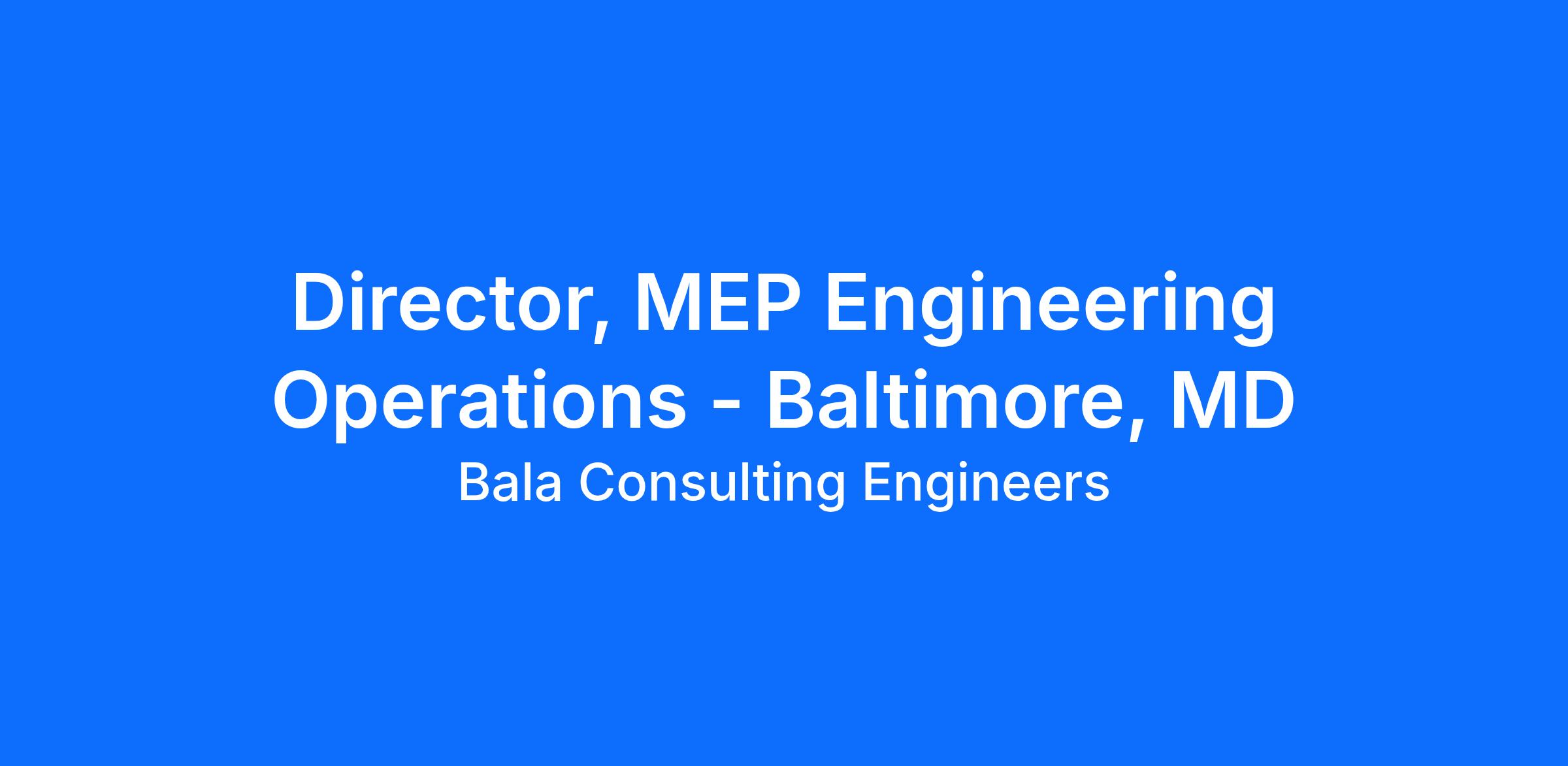 The Director of MEP Ops will broadly add value to the company and will help to enhance Bala’s reputation as a world-class organization, competing with other top firms nationally. In this role, this individual is expected to enhance Bala’s visibility and reputation in the region as well as providing technical expertise and experience.