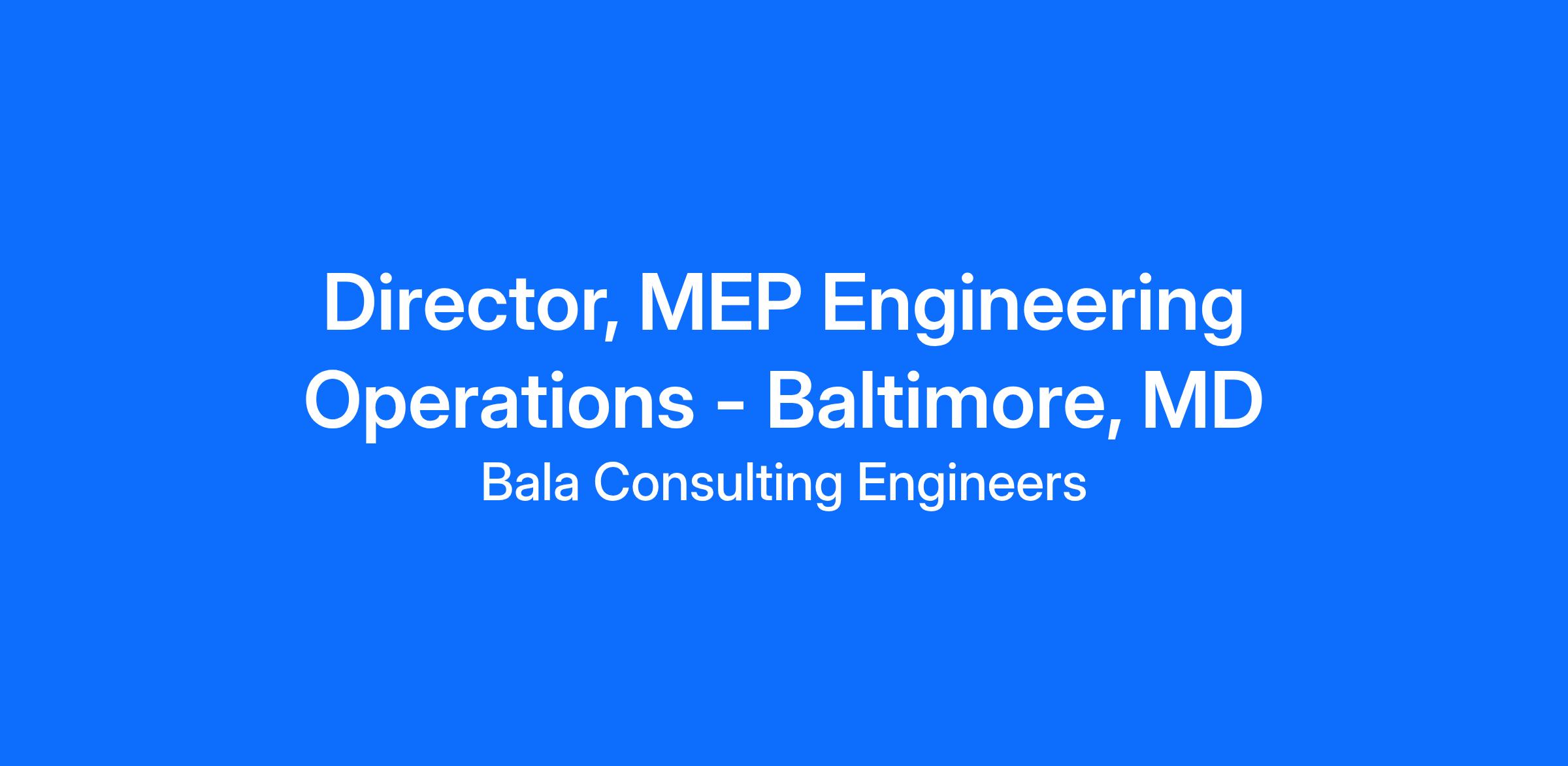 The Director of MEP Ops will broadly add value to the company and will help to enhance Bala’s reputation as a world-class organization, competing with other top firms nationally. In this role, this individual is expected to enhance Bala’s visibility and reputation in the region as well as providing technical expertise and experience.