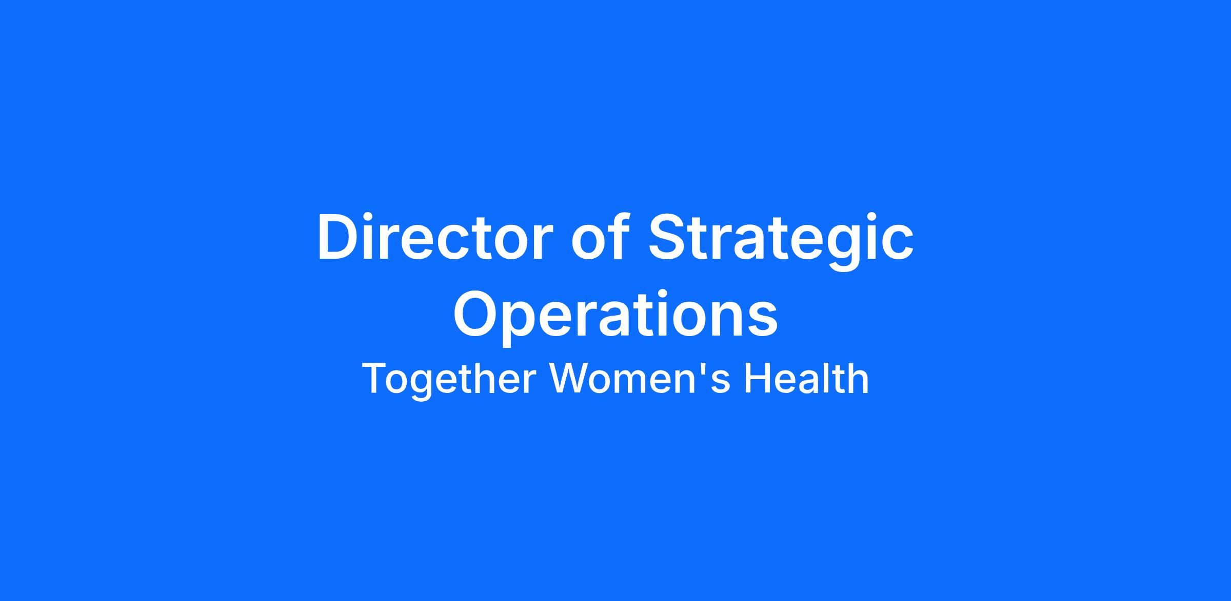 At Together Women’s Health (TWH) we are driven by our mission to improve the lives of our healthcare partners and their patients. Our focus is on bringing together the best-in-class private practices, in the women’s healthcare space, to provide a more seamless and holistic experience for our patients. We are growing and in search of a Director of Strategic Operations to join our team!