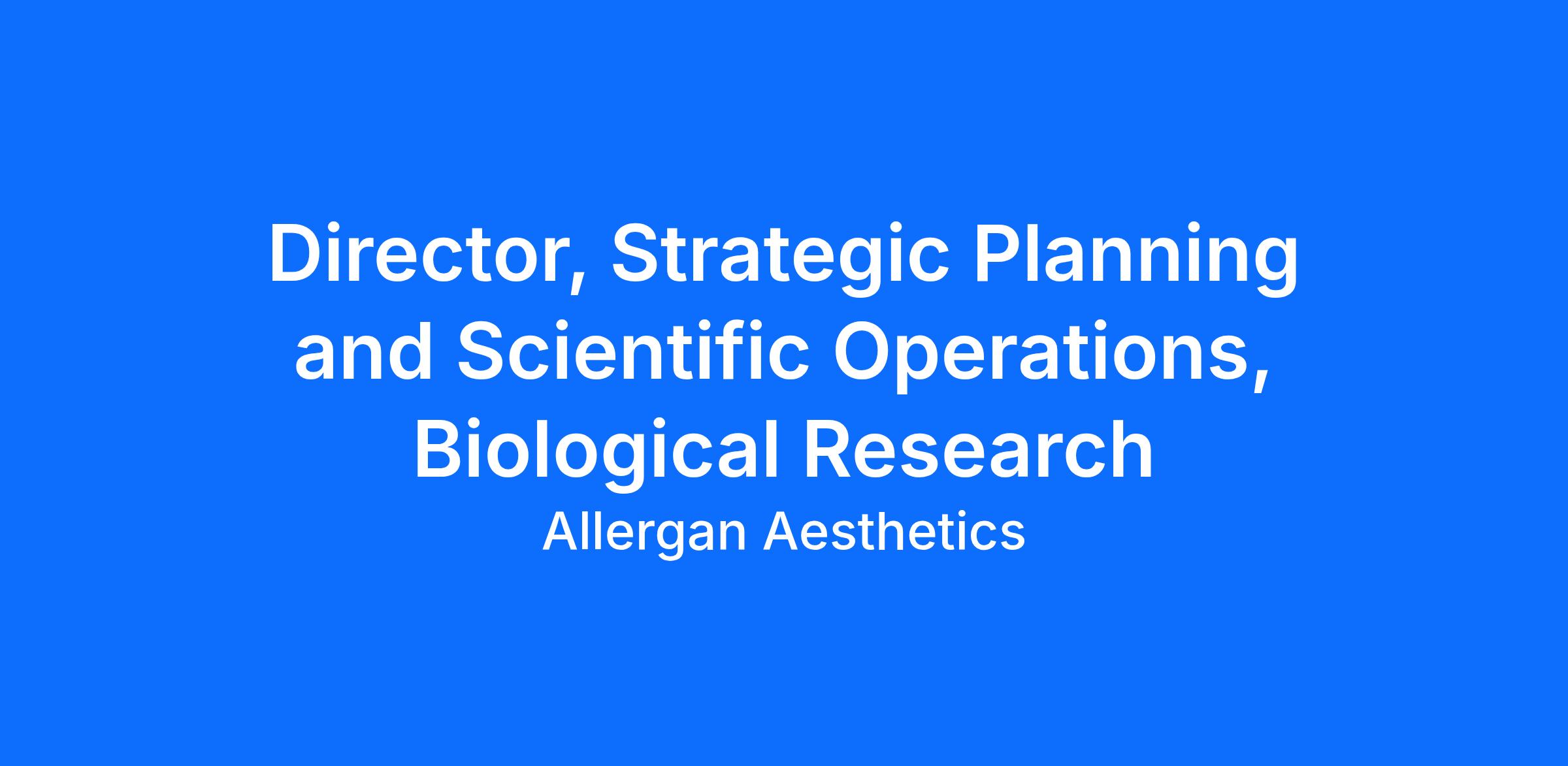 The Director of Strategic Planning and Scientific Operations, Biological Research, plays a pivotal role within the Biological Research Senior Leadership team, reporting directly to the VP of Allergan Aesthetics Biological Research (AABR) and supporting the vision for Aesthetic Pharma and Neurotoxin Discovery. This role drives communication and collaboration across the department, oversees scientific operations, provides strategic management of the neurotoxin and hair pipeline, and partners with functional and project leads to establish and track milestones and resource prioritization. The incumbent also plays a central role in planning and executing initiatives that foster partnership, strengthen culture, facilitate transparent communications, and contribute to the delivery of strategic goals.
