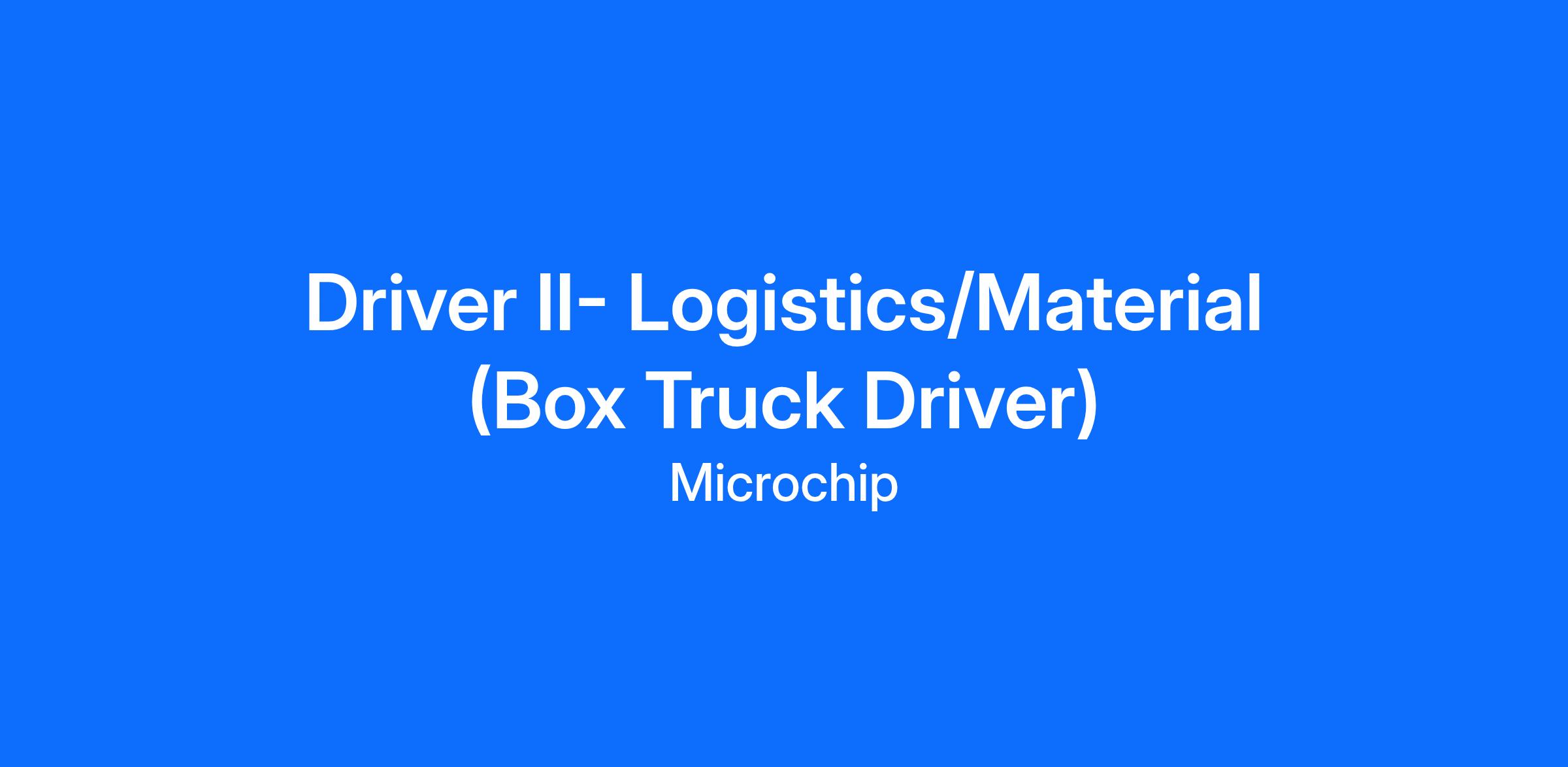 Microchip is seeking a reliable and safety-minded Box Truck Driver/Material Handler that is committed to providing exceptional transport, delivery and customer service. This role will primarily be in transportation but will also be participating in material handling and inventory management functions.