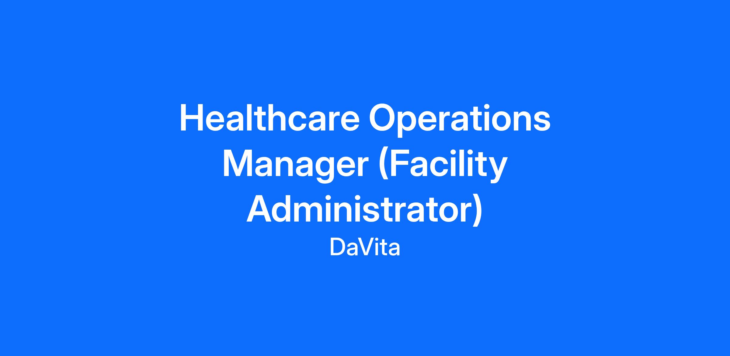 DaVita has an open position for a Healthcare Operations Manager (Facility Administrator) who must be an ambitious, operationally-focused and results-driven leader. You will directly impact patient care as the trusted front-line leader in an outpatient clinic setting. Health care experience is not required!