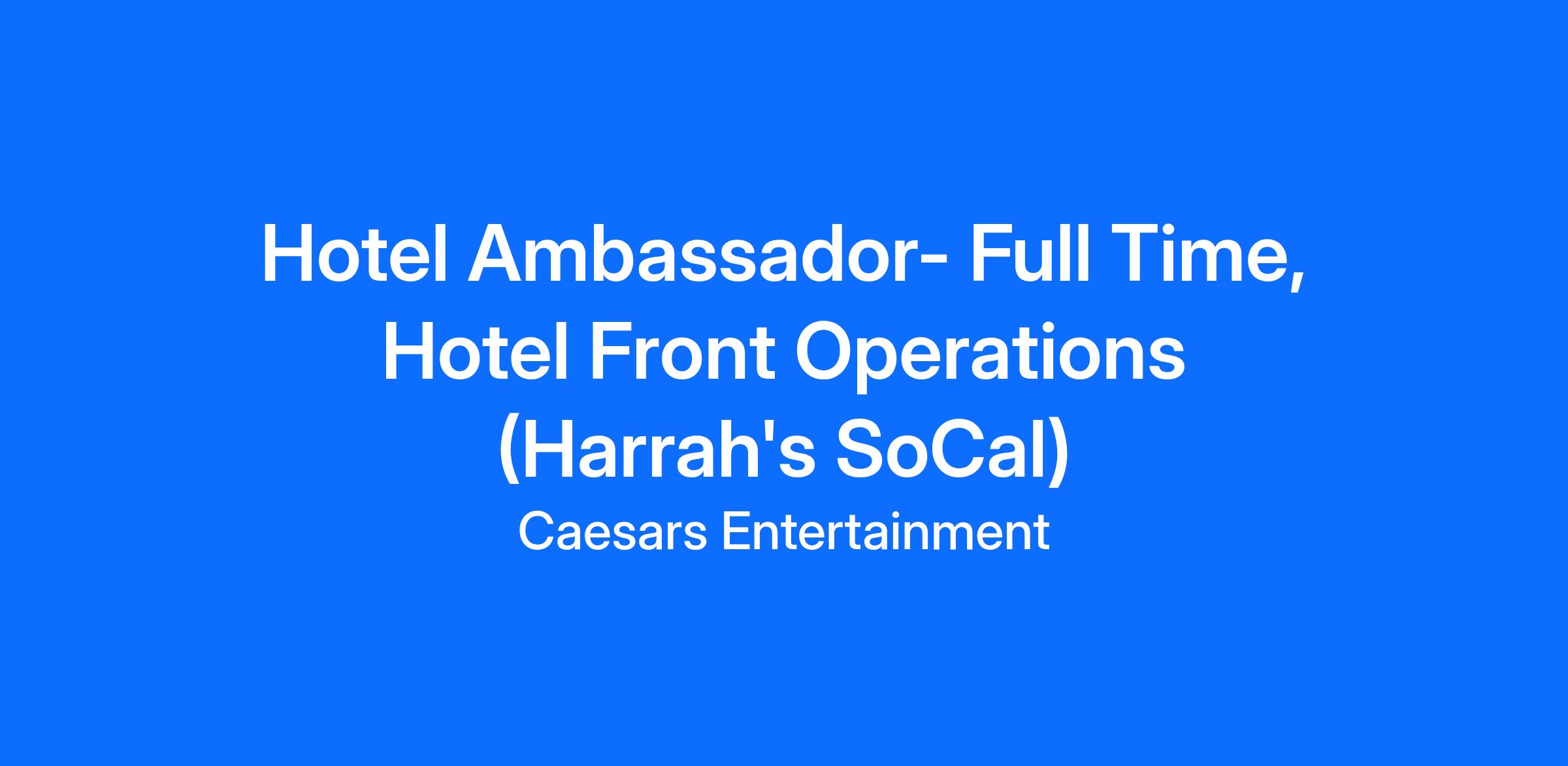 DescriptionIn conjunction with the other members of the hotel operations team, Hotel Ambassadors provide fun hospitality in a friendly manner in accordance with the Harrah’s Resort Southern California Family Style Service standards. Greets and assists each guest in a friendly and courteous manner when registering them and checking them out, as well as providing information and directions to guests regarding all services available on property. Takes ownership of guest challenges and resolves guest issues using service recovery tools.