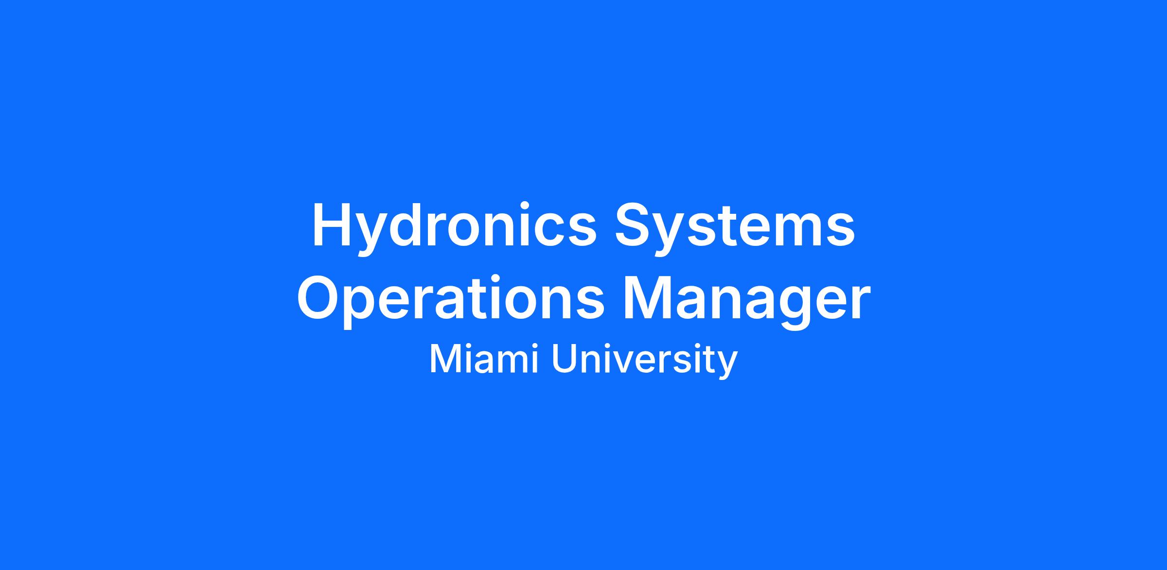 This position is directly responsible for the operation, maintenance, and strategic planning of the geothermal, chilled water, and heating hot water production and distribution systems on the Oxford and regional campuses. The Hydronics Systems Operations Manager is responsible for the management of involved personnel, annual budgets, and maintenance activities. The purpose of this position is to monitor both budget and operations to provide reliable and cost-effective utility service to the university community, serving as the university's primary technical authority for thermal utility systems.Job Description