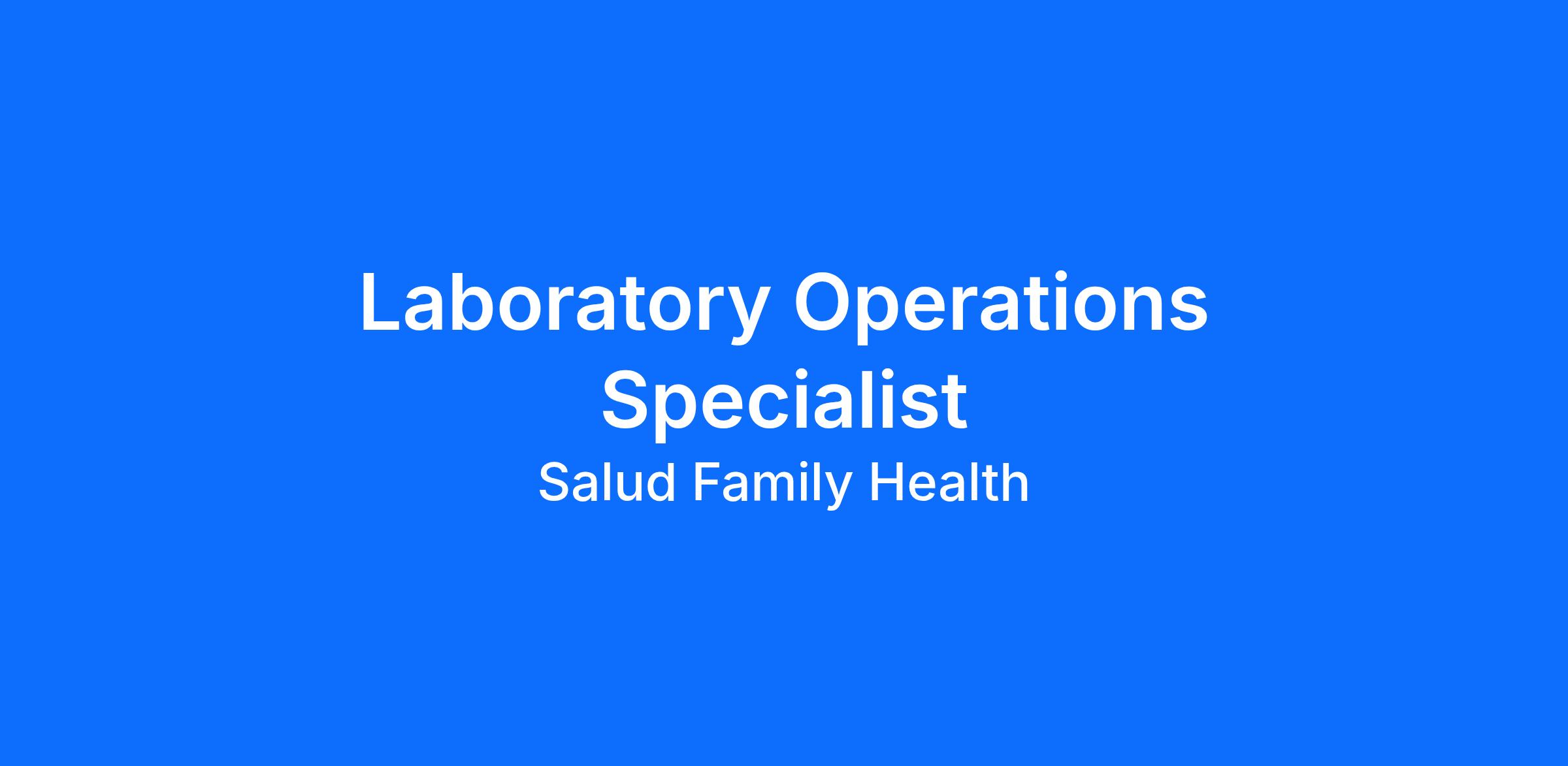 The Laboratory Operations Specialist approaches his/her tasks in a team-based care fashion that supports patients and their families in self-management, self-efficacy and behavior change. Adheres to the spirit of the SALUD Mission Statement and Core Values while performing assigned duties.