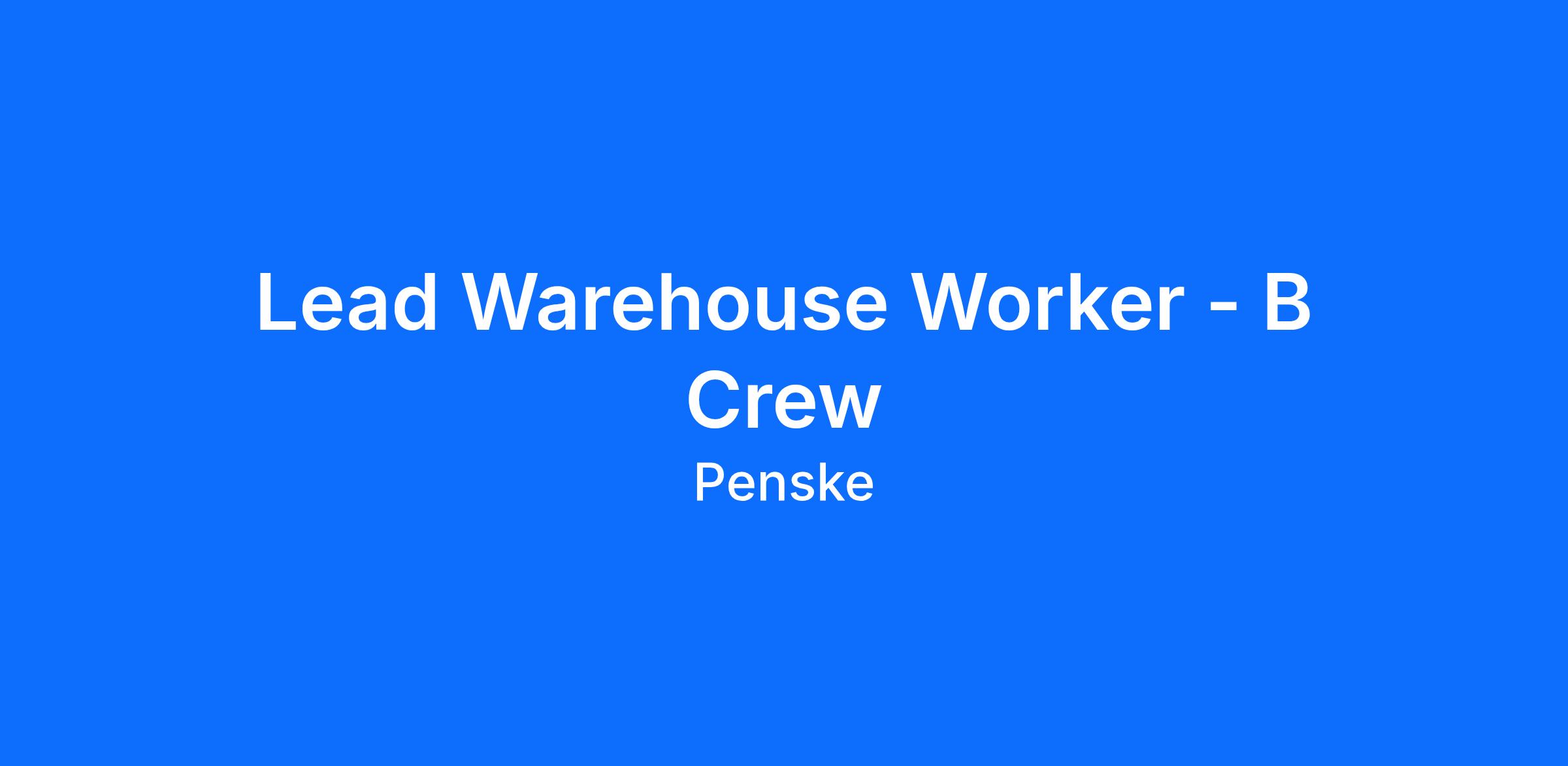 Penske Logistics is looking for warehouse associates to become part of an excellent team. This is a great opportunity for individuals who are safety conscious and have a pleasant, outgoing attitude who want to excel in a warehouse environment. Provides support and some supervision to regular and temporary warehouse associate functions. Works closely with Operations Supervisors to ensure employee productivity expectations are met. Provides a variety of responsibilities to meet the supervisors expectations.