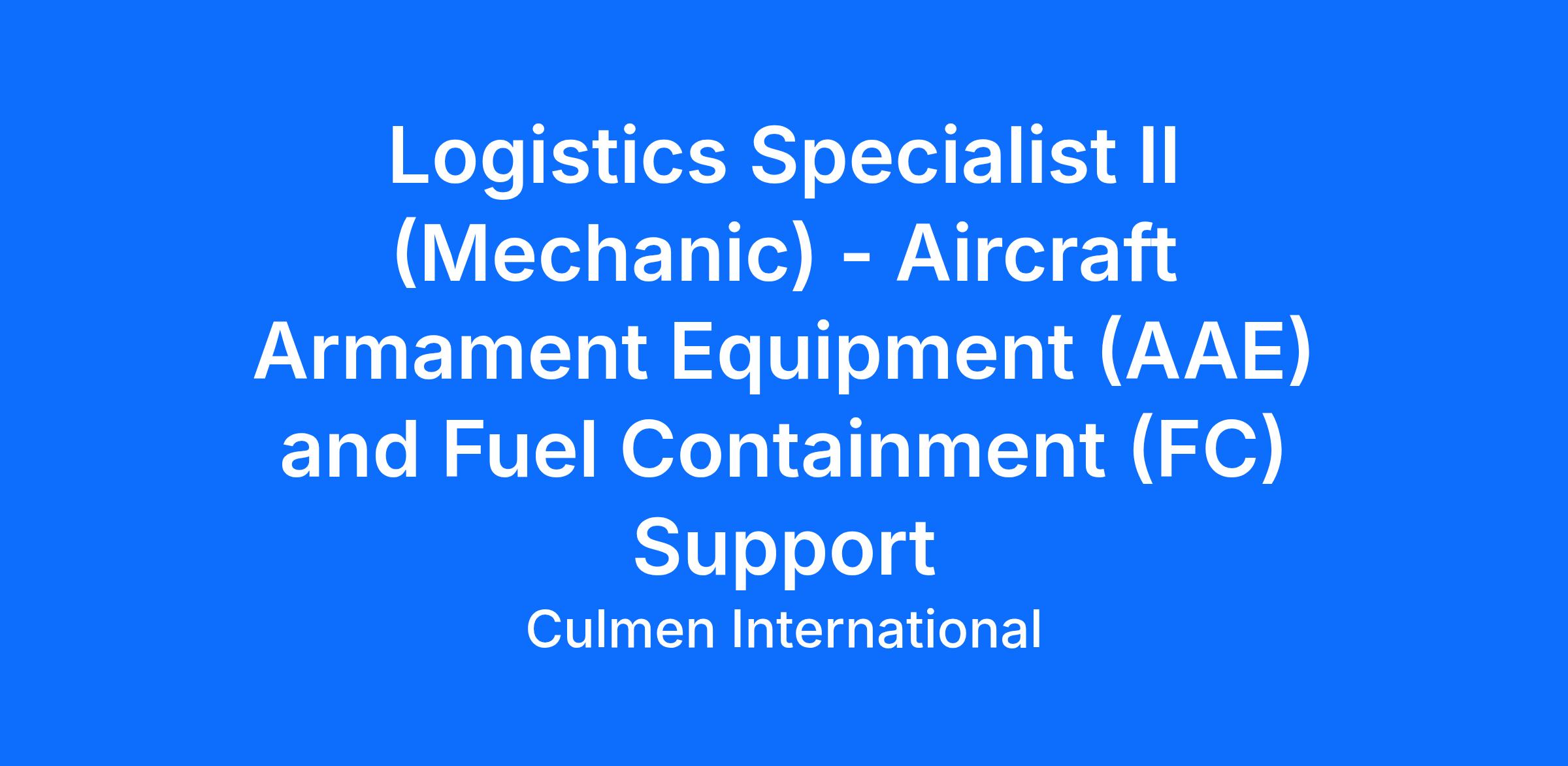 Culmen International LLC is seeking qualified candidates for a Logistics Support II - Aircraft Armament Equipment (AAE) and Fuel Containment (FC) Support position in support of the Department of Defense (DoD) as a member of our NAVAIR Precision Strike Weapons (PMA-201) Aircraft Armament Equipment (AAE) and Fuel Containment (FC)/Aerial Fueling Stores (ARS) Engineering Support Team in Jacksonville, FL.