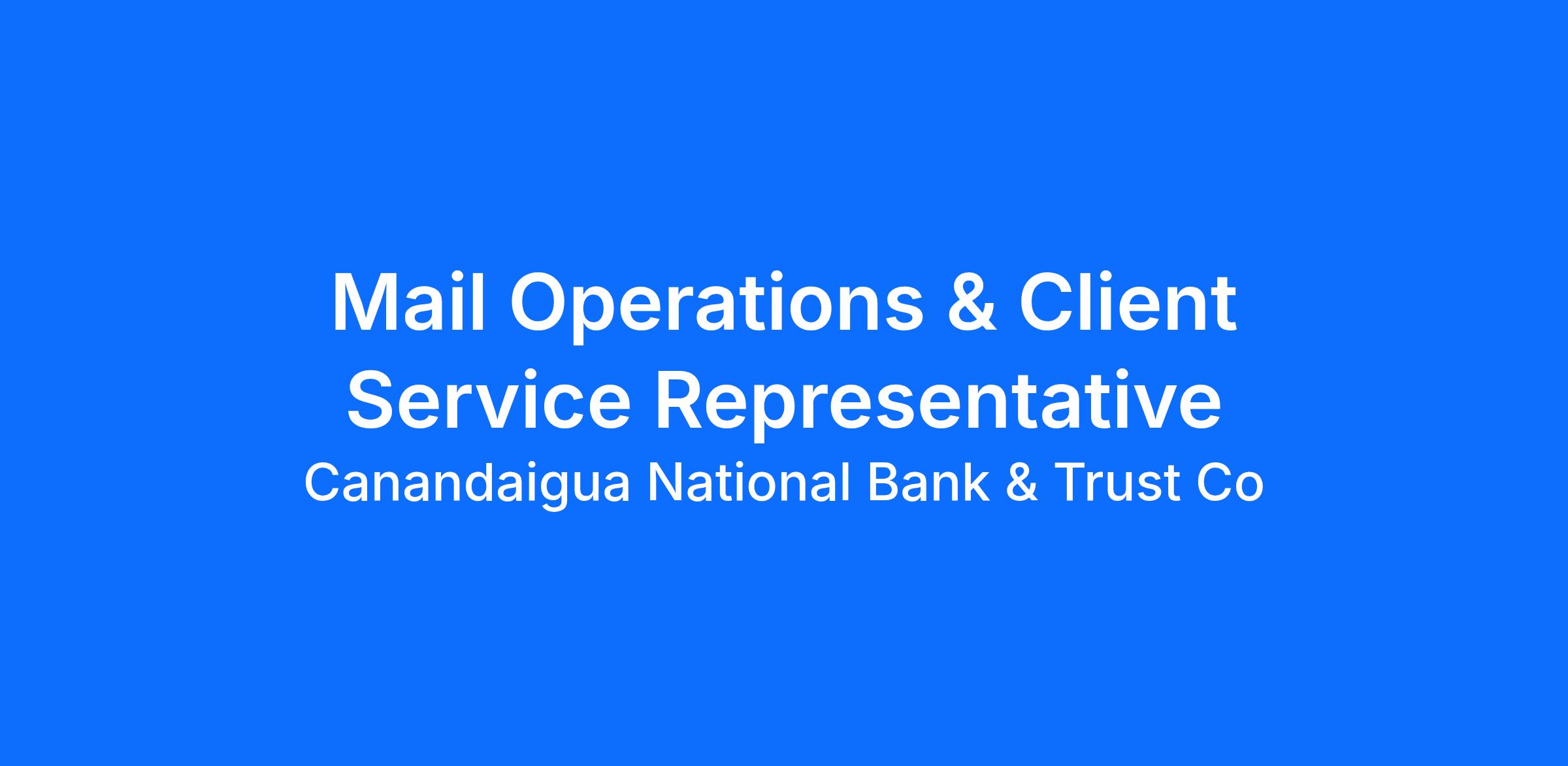 A Mail Operations Representative for Canandaigua National Bank’s Basin Park location is responsible for supporting the mail function at 1150 Basin Park. This position will also perform various clerical duties to support the client service function of the Wealth Management department. This role complies with operating policies and procedures established for the mail function, communicates with appropriate personnel, responds to inquiries or requests for information, while maintaining appropriate records and providing assigned reports.