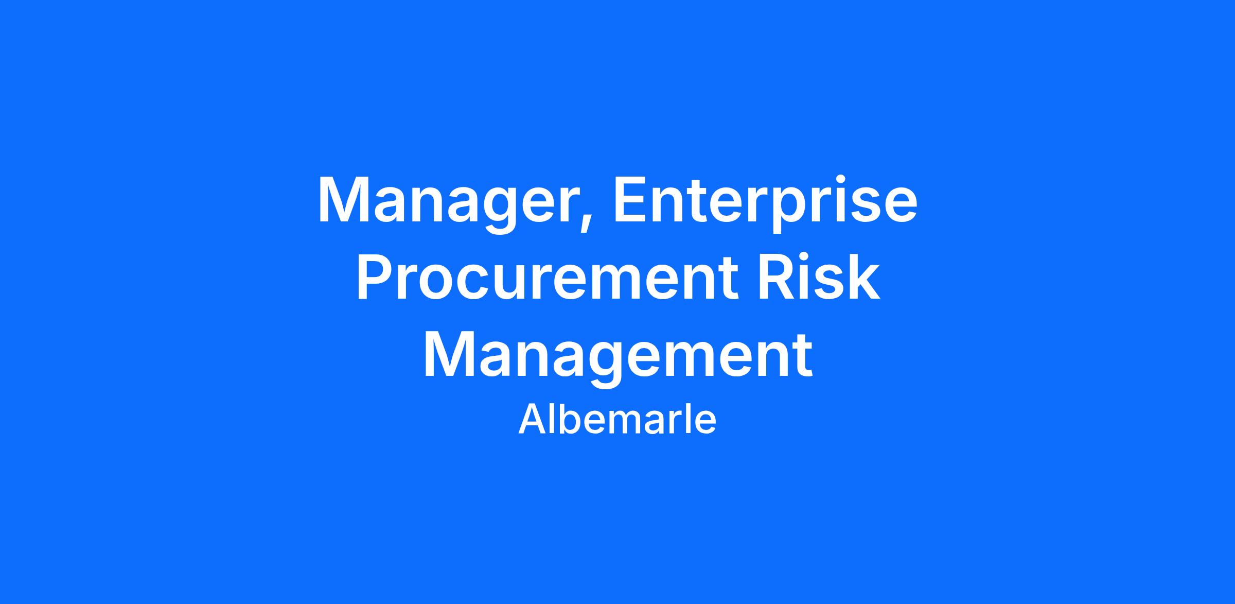 This role supports the Director in embedding procurement risk management (PRM) governance, tools, and analytics into sourcing, supplier onboarding, and performance management. The Manager partners with cross-functional teams—including Legal, Compliance, Finance, IT Security, and Enterprise Risk Management—to ensure Albemarle’s supplier base and procurement activities meet regulatory, ESG, and operational resilience expectations.