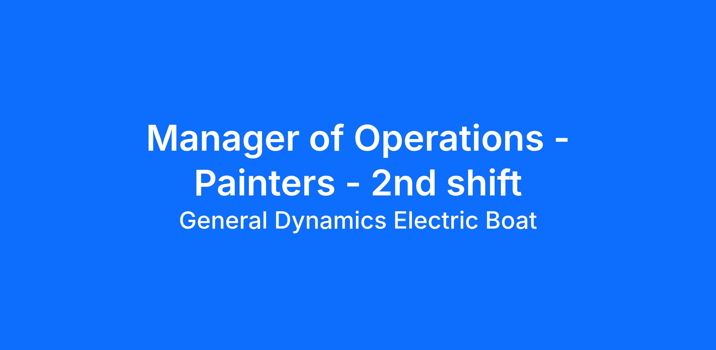 The Painter Operations Manager will be responsible for managing all aspects of trade operations within the Groton facility on off shifts. The candidate must manage the performance of the off shift; safety, quality, cost, schedule, continuous improvement and employee communications. Candidates must also possess a proven track record in these areas. Must have effective problem solving skills. Candidate must be able to promote a positive team environment and be highly motivated with strong interpersonal skills. Must be fully cognizant of OSHA requirements relating to specific trades and will be held accountable for enforcement of standards and shipyard safety practices. Must be able to interpret and implement all job requirements utilizing EB systems and procedures. This position is on 2nd shift, with some overlap on 1st and 3rd shifts at times based on business needs.