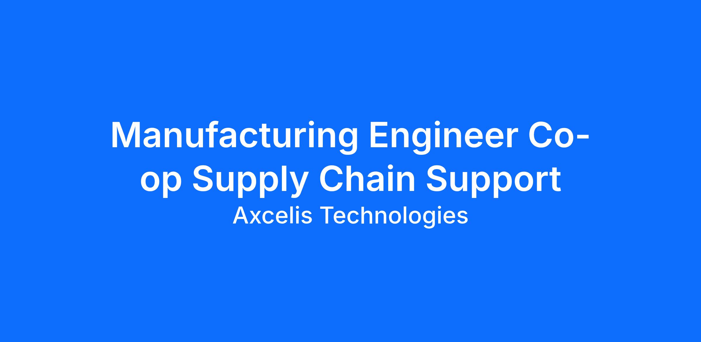 As a Manufacturing Engineer co-op (Supply Chain Support), you’ll investigate and resolve technical questions and issues from our network of worldwide suppliers providing parts to enable the production of Axcelis semiconductor manufacturing equipment. You will gain familiarity with many types of mechanical and electrical components and learn to read and interpret engineering drawings. You will interface with many internal departments such as Engineering, Purchasing, Manufacturing, and Quality.