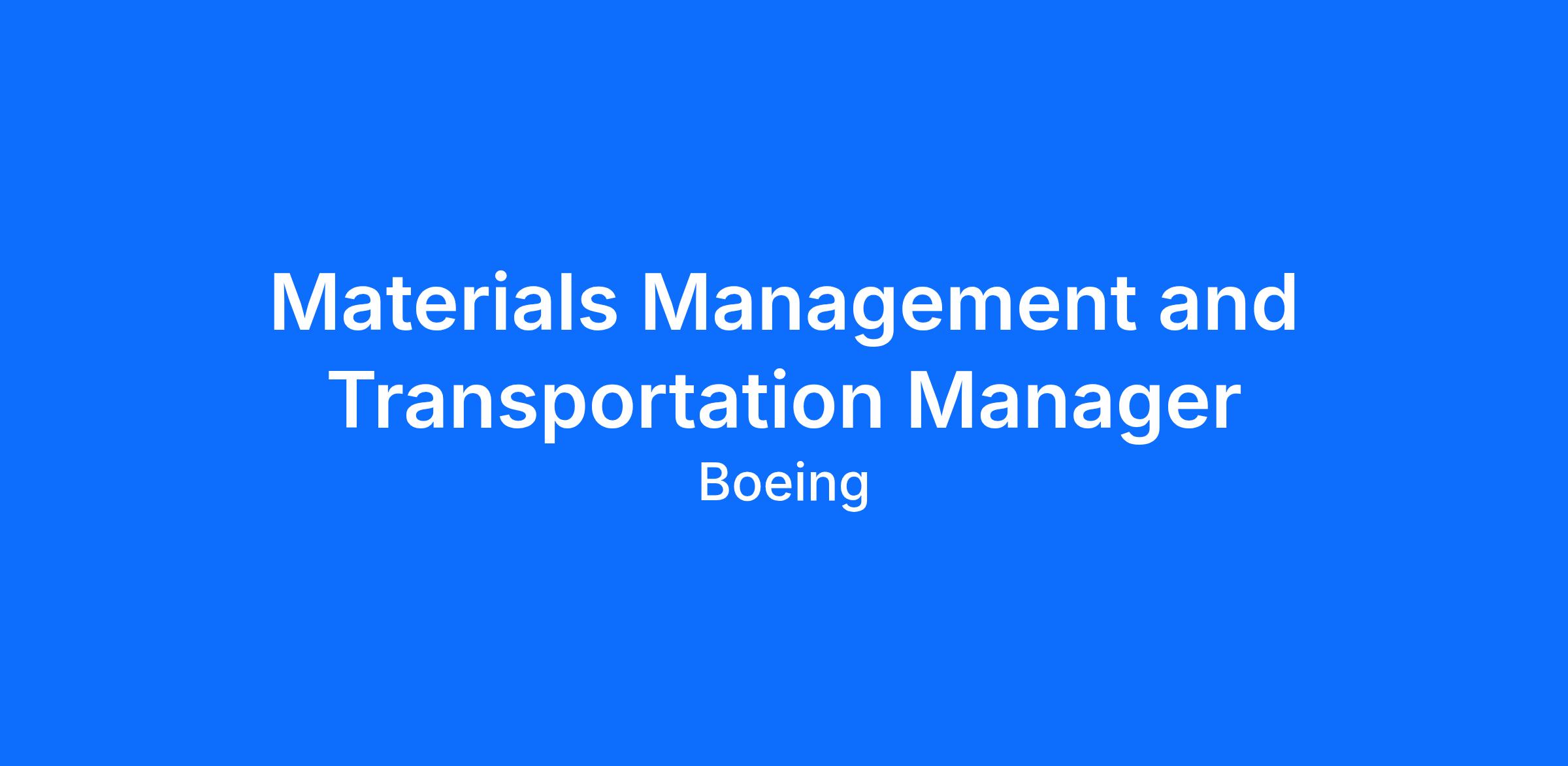 The Boeing CompanyBoeing Commercial (BCA) is hiring for a Materials Management & Transportation Manager (K Level) to join the Propulsions SC (PSC) team located in North Charleston, South Carolina.