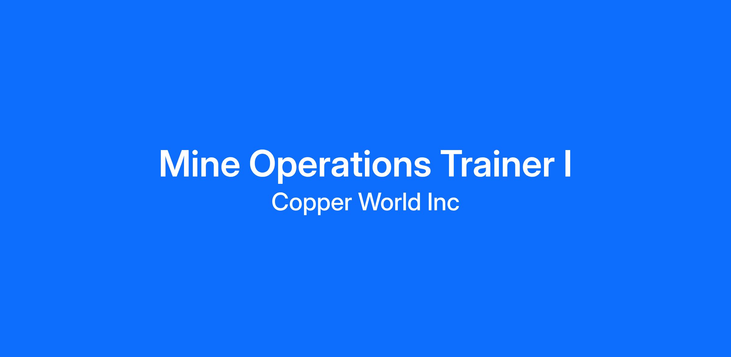 Reporting to Mine Operations Trainer II, the Mine Operations Trainer I is responsible in assisting in the development and implementation of training programs for the Copper World, Inc. Projects department.