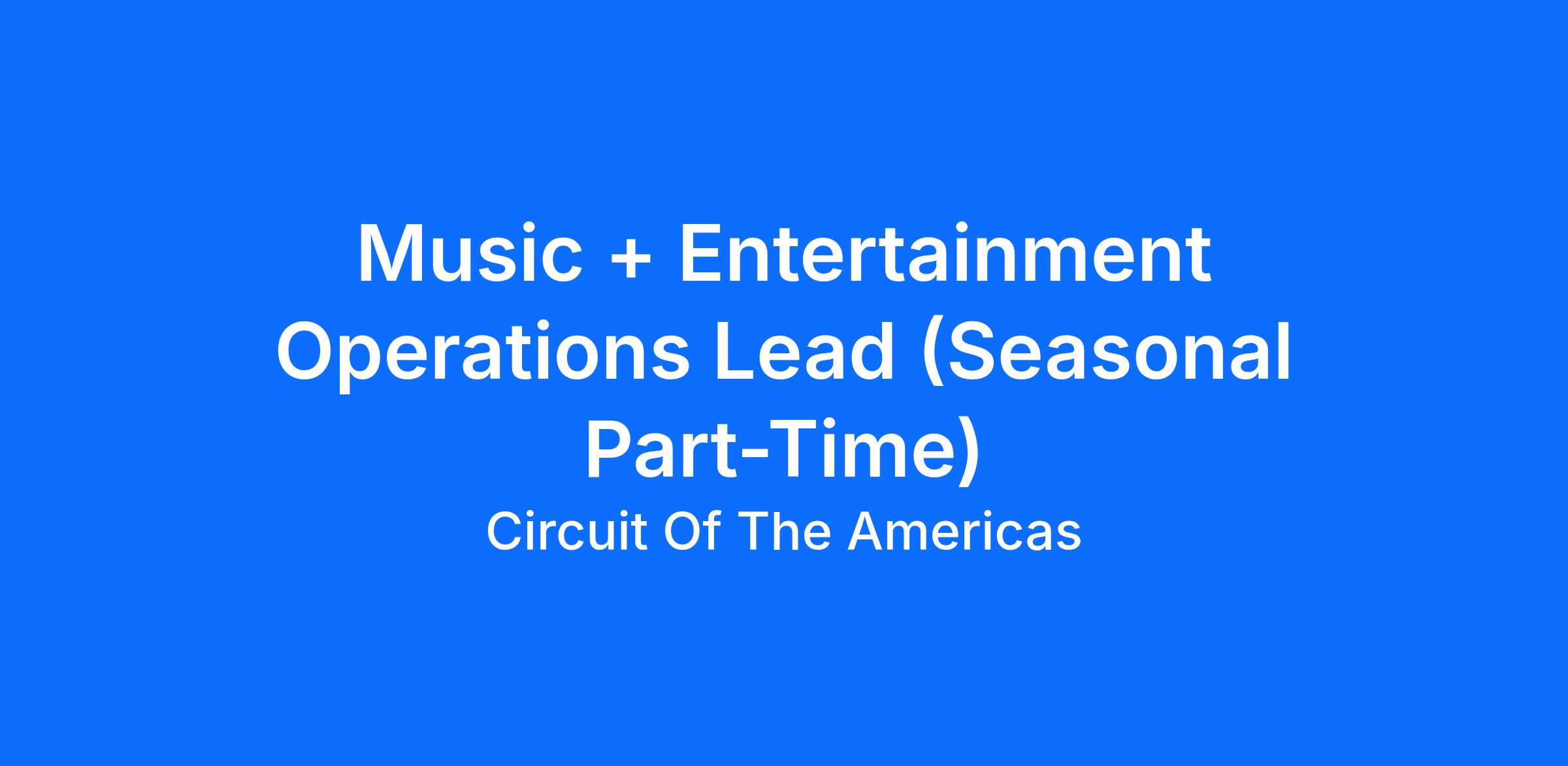 Music + Entertainment Operations Lead reports directly to the Music + Entertainment Operations Manager with tasks necessary to prepare for the various concerts, races, and events held at the Circuit of The Americas. The position will help with assigned tasks in and around the Amphitheater, Grand Plaza, and Fan Field to prepare all zones to be show-ready. The position is Seasonal Part-Time.