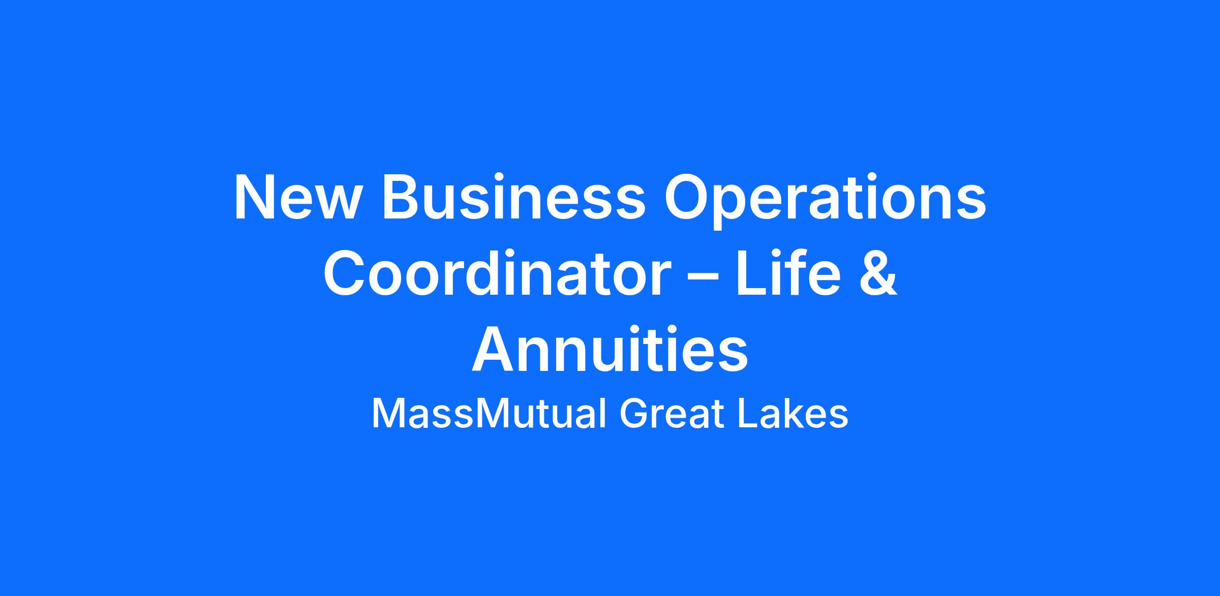 The New Business Coordinator – Life & Annuities plays a critical role in serving career and brokerage advisors by ensuring the smooth progression of an application from intake through policy delivery. The role requires an individual who can combine underwriting and product knowledge, sound judgment, and along with a focus on operational excellence.