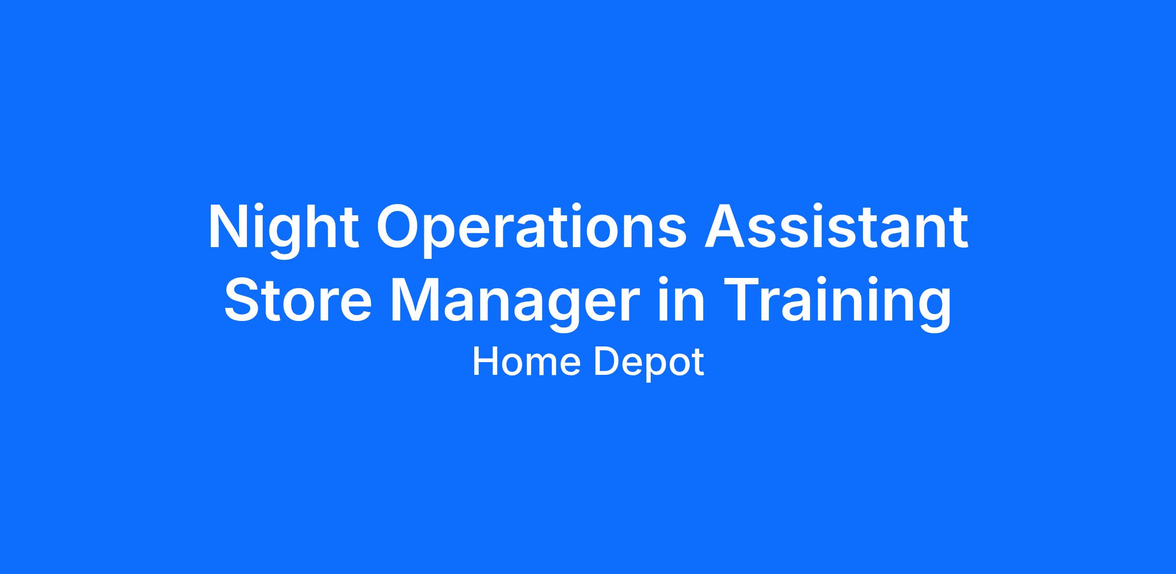 Night Operations Assistant Store Manager in Training (NOASM-IT) will gain hands-on experience in the key responsibilities and functions of a Night Operations Assistant Store Manager at The Home Depot. The OAM - IT will undergo a comprehensive training program that includes hands-on experience, mentorship, and leadership development. During their training, NOASMs in Training will become familiar with Manager on Duty duties and will focus on overseeing overnight freight operations to ensure the successful execution of core freight handling programs. They will frequently collaborate with Night Replenishment Managers (NRMs) to manage the unload, pack out, and pack down NOASM’s in Training will collaborate with the Store Manager, Assistant Store Managers (ASMs), and field teams and learn to develop and implement strategies that boost sales and profitability, creating actionable game plans for departmental success, and ensuring smooth department operations. NOASM - ITs are expected to lead by example. Additionally, they have a responsibility to uphold, maintain, and support all lawful company policies and positions. During the NOASM-IT training period, which will be up to 6 weeks, you will be learning to execute OASM key responsibilities.