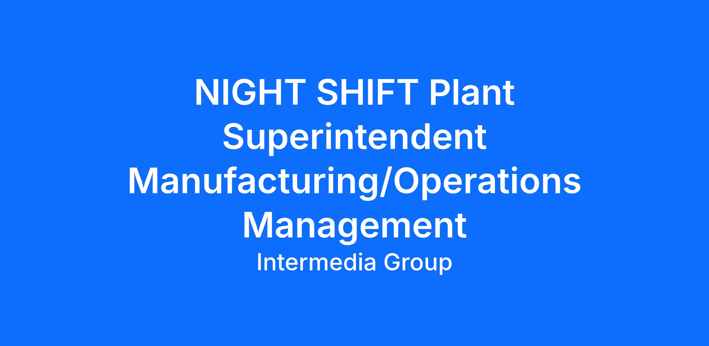 OPEN JOB: NIGHT SHIFT Plant Superintendent • Manufacturing/Operations Management LOCATION: Sumter, South Carolina ****Relocation Assistance Available SALARY: USD $110,00 to $147,900 INDUSTRY: Medical Equipment / Devices JOB CATEGORY: Manufacturing - Plant Management