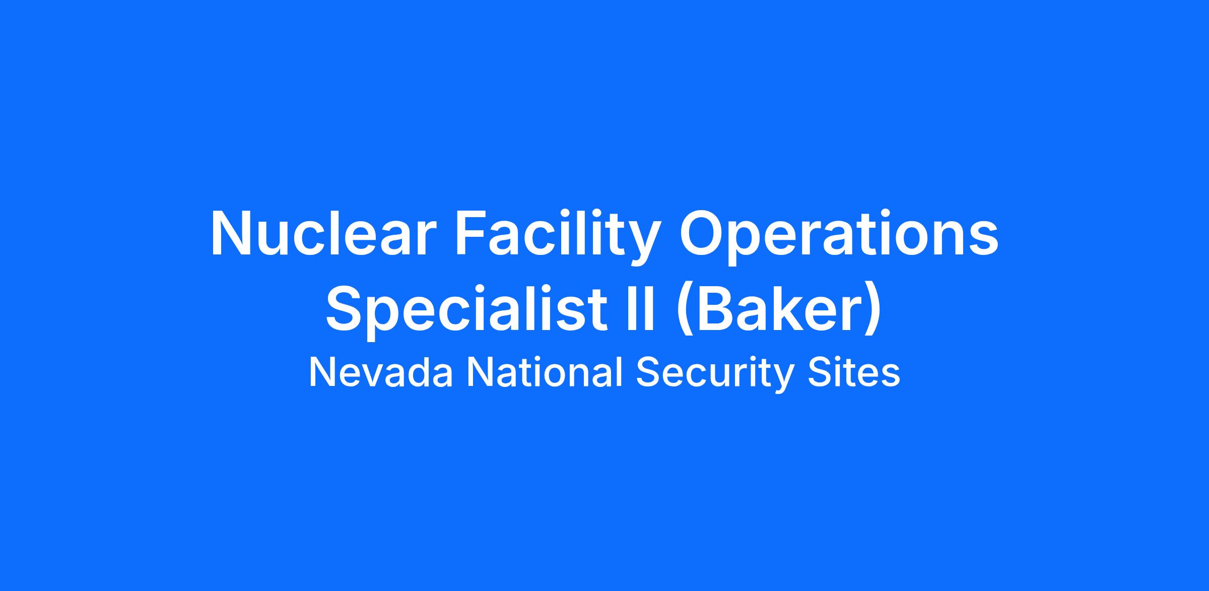 The Nuclear Facility Operations Specialist II supports the Nevada National Security Site (NNSS) High Hazard Facilities, Baker facility or assigned as an Operator Technician II. The Operator Technician II will perform support duties to maintain facility, operability and mission support as detailed below. This position is interchangeable with the same position at the BEEF facility. The primary purpose is to ensure that facility operability is consistently safely maintained according to U.S. Department of Energy (DOE), federal, and state requirements.