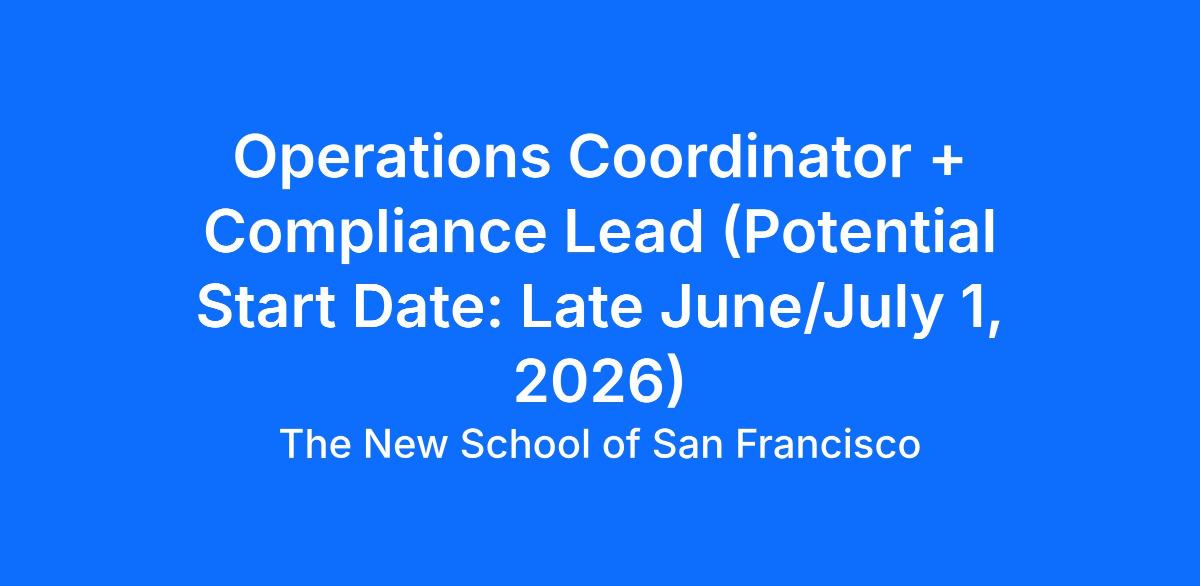 Operations Coordinator and Compliance Lead- At New School SF, the Operations Coordinator and Compliance Lead will play a central role in the everyday life of our community. This includes overseeing the front office, building relationships with families and staff, ensuring a safe and healthy school environment, and supporting the overall operations of the school. In your day-to-day, you’ll ensure systems are maintained and experiences are delivered in alignment with the New School’s core values. You can expect to wear many hats as you keep projects moving forward and implement best-in-class operations. You will report to the Chief Operating Officer