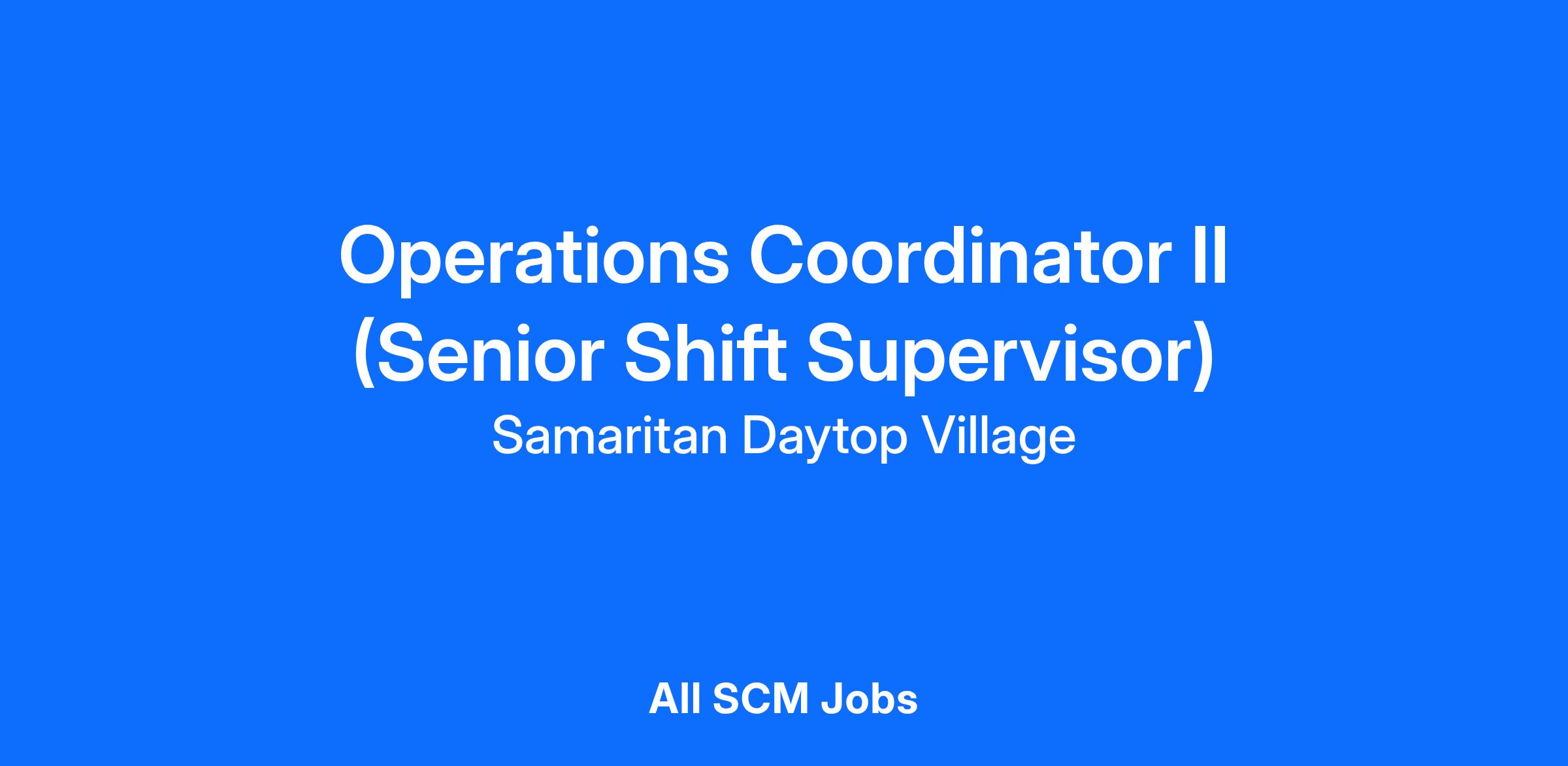 Under the general direction of the Program Director or Operation Coordinator I, the Operations Coordinator II (Senior Shift Supervisor), responsible for monitoring the shelter environment and specific program systems to ensure security, efficiency, and safety on assigned shifts. Responsibilities also include monitoring and enforcing the treatment services schedule of activities and additional events to make sure all services are delivered as scheduled and clients' external appointments are dispatched. Will serve as lead to Shift Supervisors as needed.