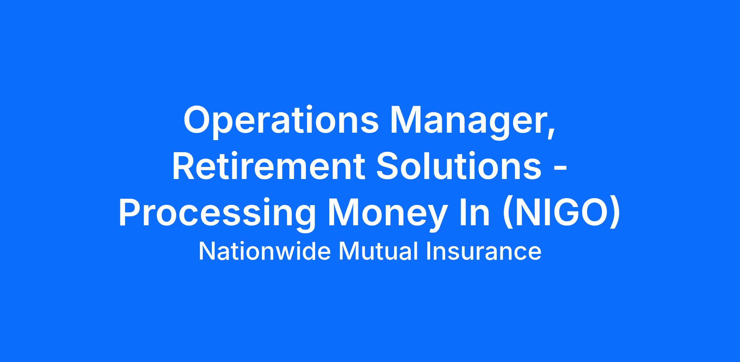 The Manager, Processing Money In (NIGO) plays a critical leadership role within Nationwide’s Retirement Solutions Operations organization. This team is responsible for resolving “Not In Good Order” (NIGO) retirement plan enrollment & beneficiary forms, rollovers, and contributions—funds that cannot be processed due to missing, inaccurate, or incomplete information—and ensuring they are researched, corrected, and applied accurately and timely.
