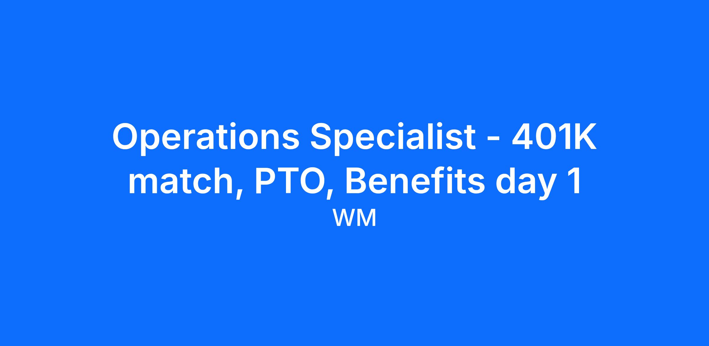At WM, each eligible employee receives a competitive total compensation package including Medical, Dental, Vision, Life Insurance and Short Term Disability. As well as a Stock Purchase Plan, Company match on 401K, and more! Our employees also receive Paid Vacation, Holidays, and Personal Days. Please note that benefits may vary by site.