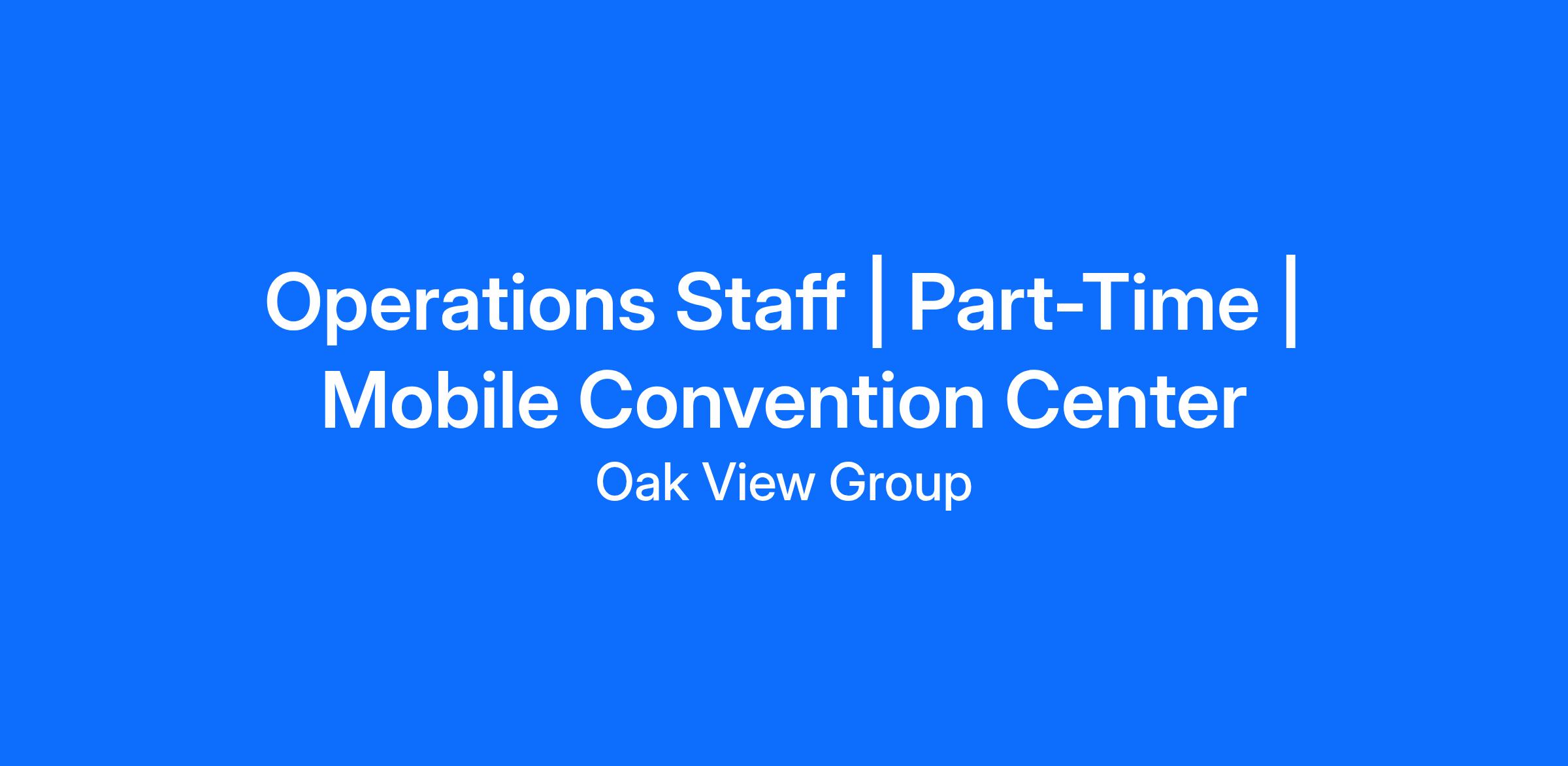 This position is on-site at the Mobile Convention Center. Standard business hours apply, with occasional flexibility required to support events, including mornings, evenings and weekends as needed. Must maintain regular attendance and a professional presence.