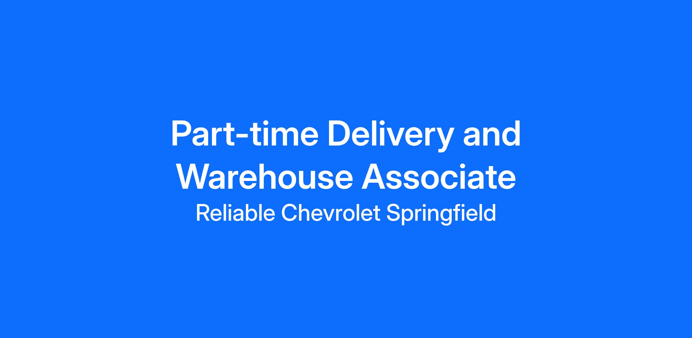 The Part-time Delivery and Warehouse Associate at Reliable Chevrolet Springfield is responsible for supporting the efficient operation of the dealership's delivery and warehouse department. This individual will primarily be responsible for assisting with vehicle deliveries and maintaining inventory in the warehouse. The position is part-time at an hourly rate of $16.