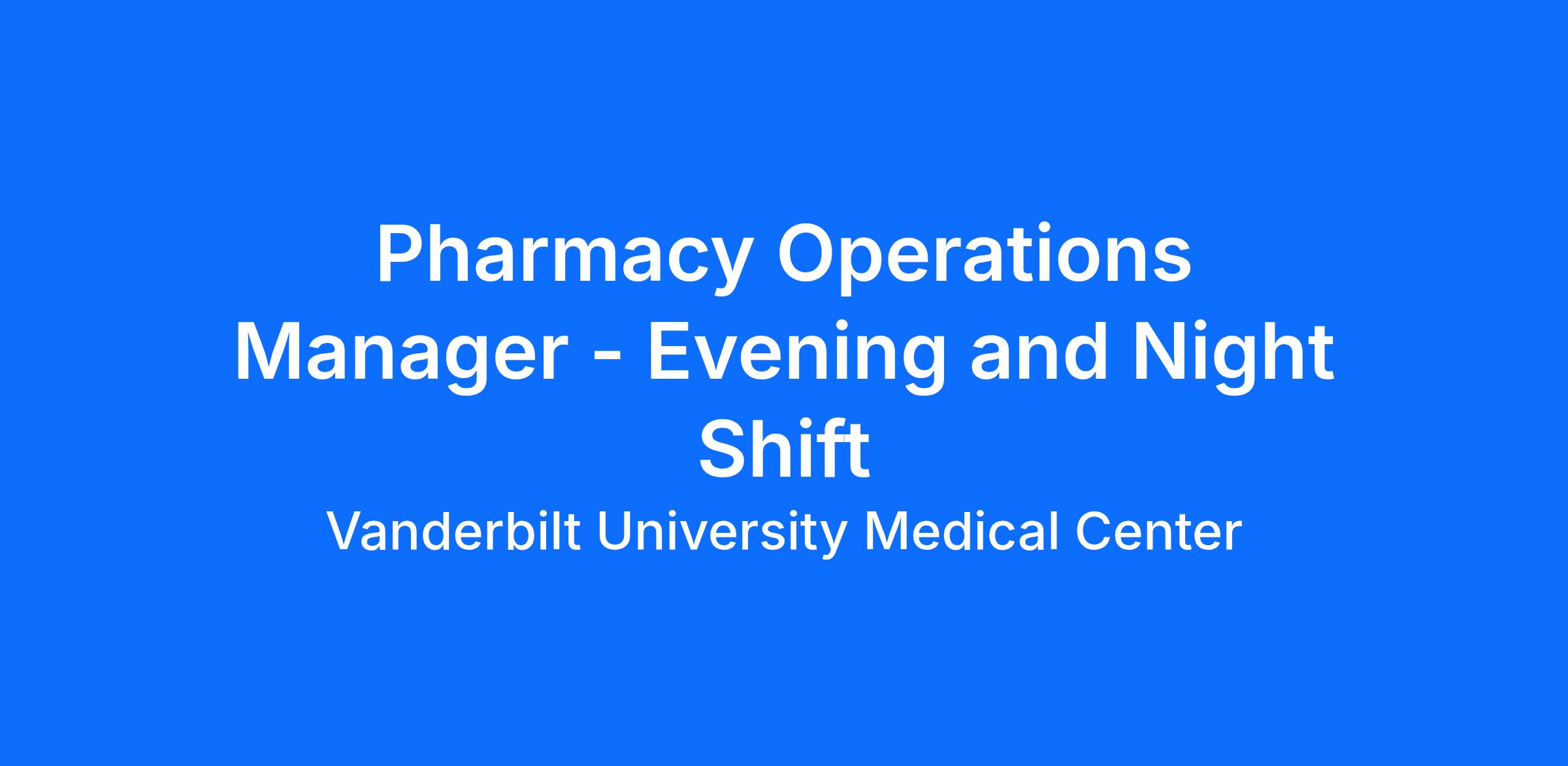The Evening and Night Shift Pharmacy Operations Manager at Vanderbilt University Hospital is responsible for oversight of evening and night shift pharmacy operations in Central Pharmacy, Sterile Products, and the OR and works collaboratively with the pharmacy operations managers of those defined areas to ensure continuity of service in our 24-hour operations.