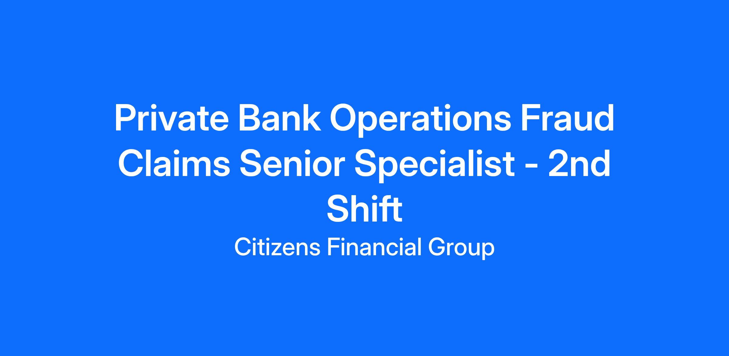DescriptionAs a Fraud and Claims Sr. Specialist, you’ll play a pivotal role in our Fraud and Claims Operations group, one of our most critical departments at Citizens. Our team is dedicated to protecting our customers, maintaining the highest standards of service, and ensuring the integrity of financial transactions.