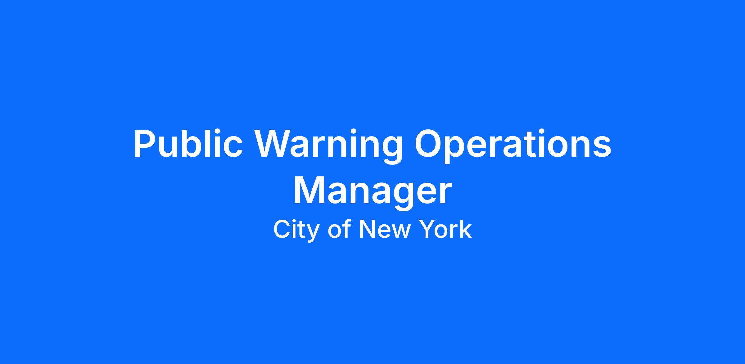 Reporting to the Director of Public Warning with latitude for independent initiative and judgment, the Public Warning Operations Manager is responsible for strategic, administrative, and operational support of New York City’s Public Warning Unit, including, but not limited to, the Notify NYC program, Wireless Emergency Alerts, and the Emergency Alert System.