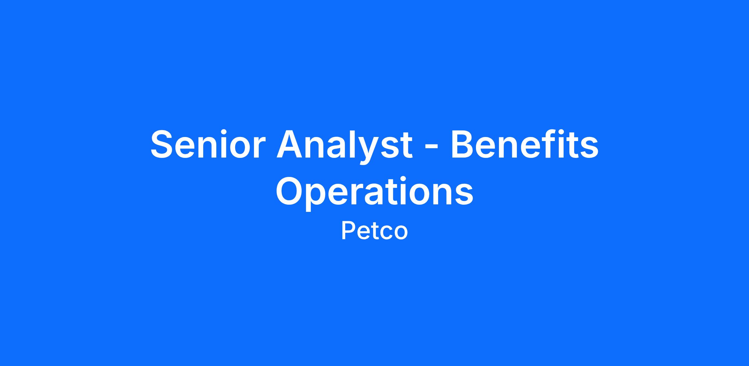 The Senior Benefits Analyst plays a key role in supporting Petco's overall health & welfare benefits, including medical, dental, vision, and supplemental benefits. This role partners closely with internal stakeholders and external vendors to ensure benefits are compliant, cost-effective, competitive, and aligned with the organization’s total rewards strategy. The ideal candidate brings strong analytical and benefits expertise, with the ability to translate complex data into clear, actionable insights. Success in this role requires a deep understanding of health & welfare plans, strong data interpretation skills, HR knowledge, excellent communication skills, attention to detail, and the ability to thrive in a fast-paced and dynamic environment.