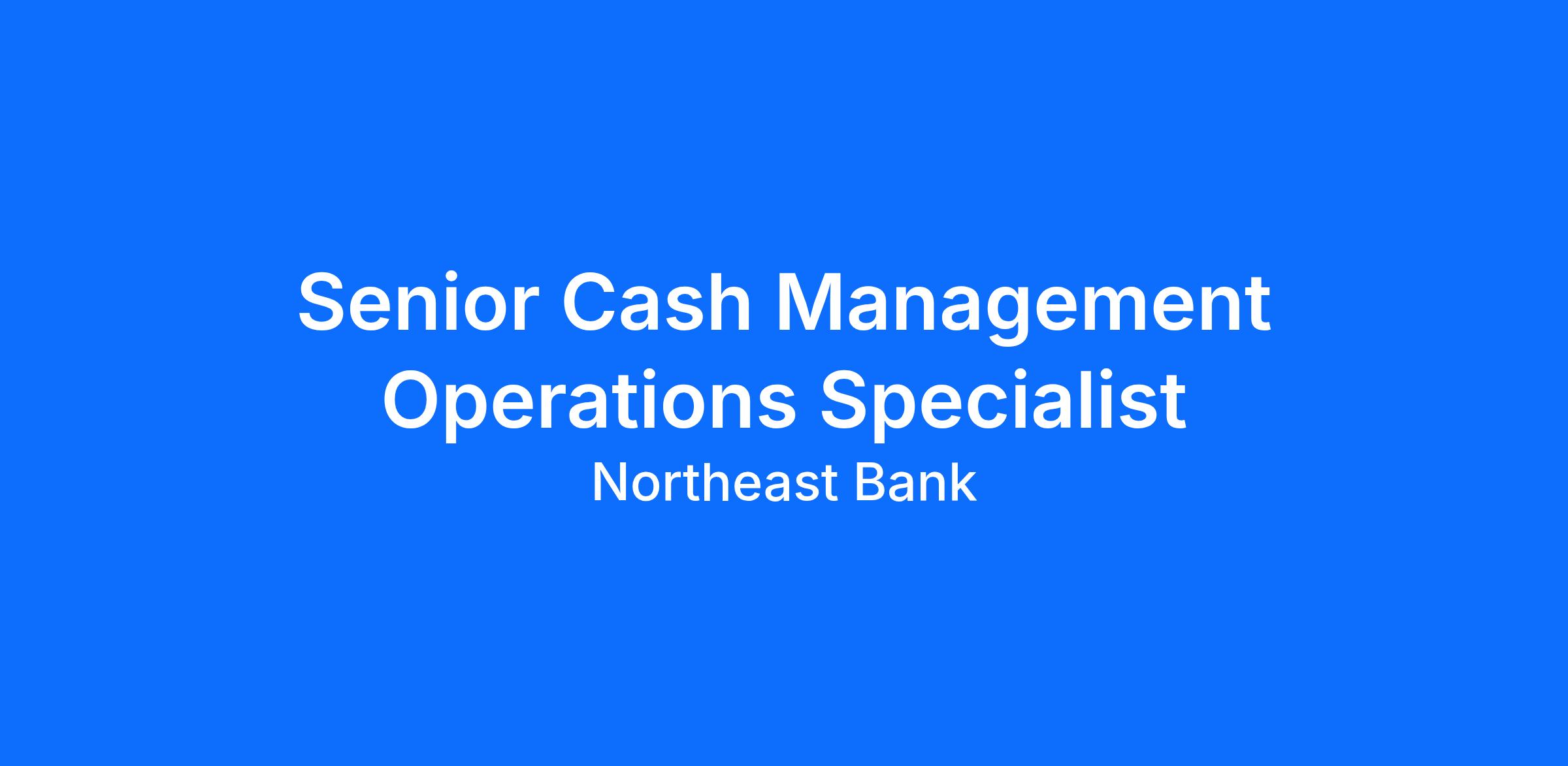 POSITION SUMMARY: The Senior Cash Management Operations Specialist is a member of the Deposit Services team supporting the banks efforts and providing quality control. Ownership in areas of operational expertise including but not limited to: Cash Management Services, Wires, Digital Banking for both consumer and business, ACH and other electronic banking tasks. This position will be required to contribute and advocate for efficiency within the department as well as the banking centers and business banking teams. Responsible for the validity of the bank’s customer data on the bank systems and ensuring all deposit account documentation follows Federal and State regulations and bank policy.