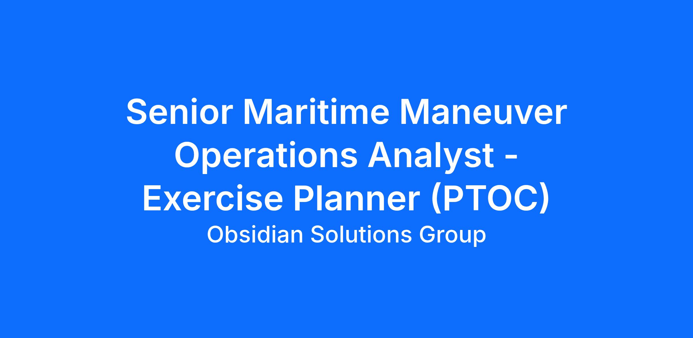Obsidian Solutions Group (OSG) is seeking a Senior Maritime Maneuver Operations Analyst – Exercise Planner to provide expertise to the External Elements (EXELMS) section of MSTP to support USMC MEF/MEB integration with the Navy /Maritime Component to support MEF/MEB-level exercise design, planning, and execution. Tasks include scenario development, travel to exercise lifecycle events, planning practical application mentoring, warfighting seminar product preparation and delivery, operational orders development, higher headquarters replication, and after-action analysis with written product preparation.