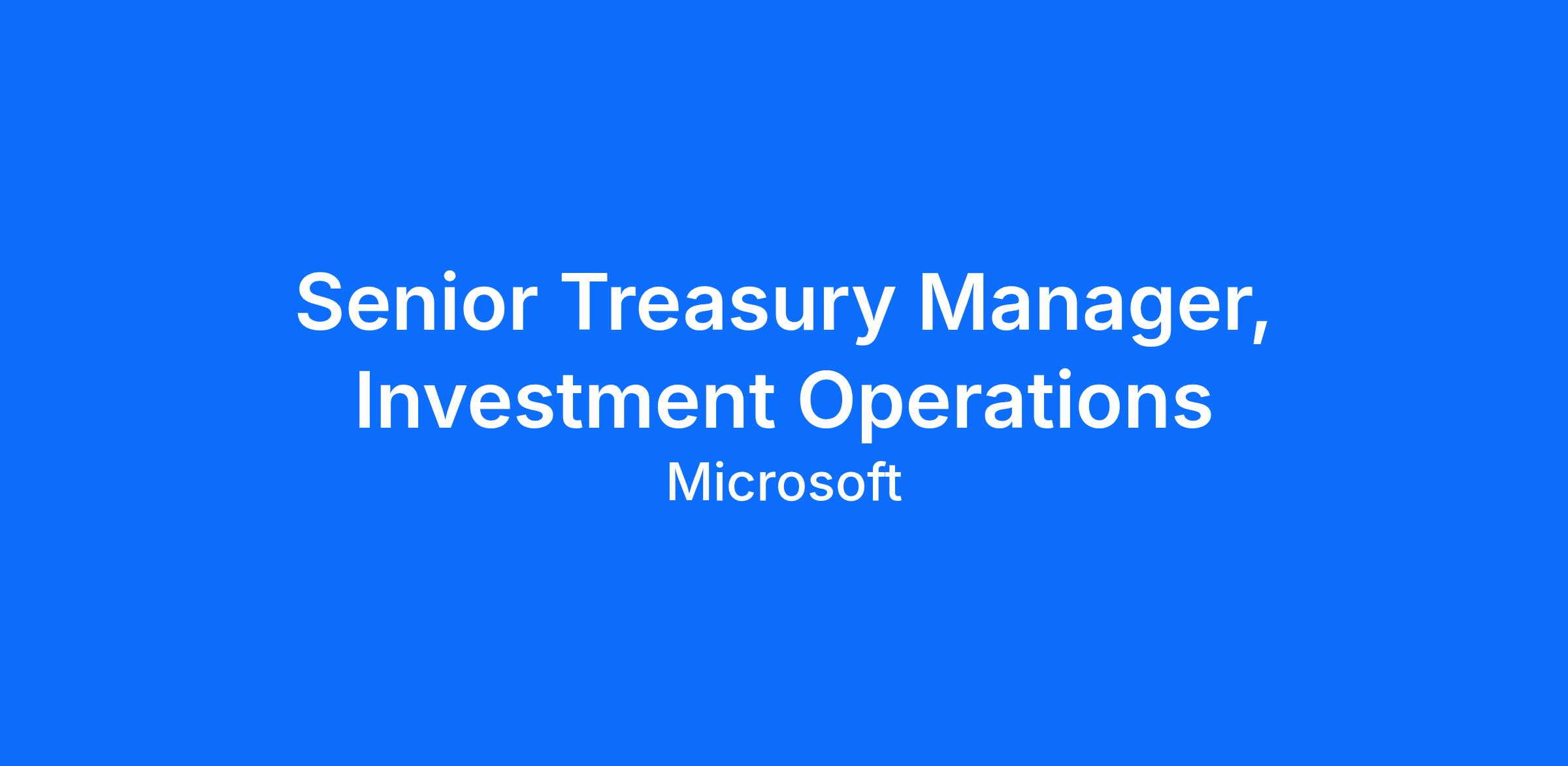 The Treasury Operations team is seeking a dynamic and experienced Senior Treasury Manager, Investment Operations, to oversee critical functions within Microsoft’s $120 billion investment portfolio. This role plays a pivotal part in ensuring operational integrity across investment trade settlements, foreign exchange (FX), and share buyback programs. Ideally, you will bring deep expertise in fixed income securities, FX, derivatives, collateral management, and financial systems.