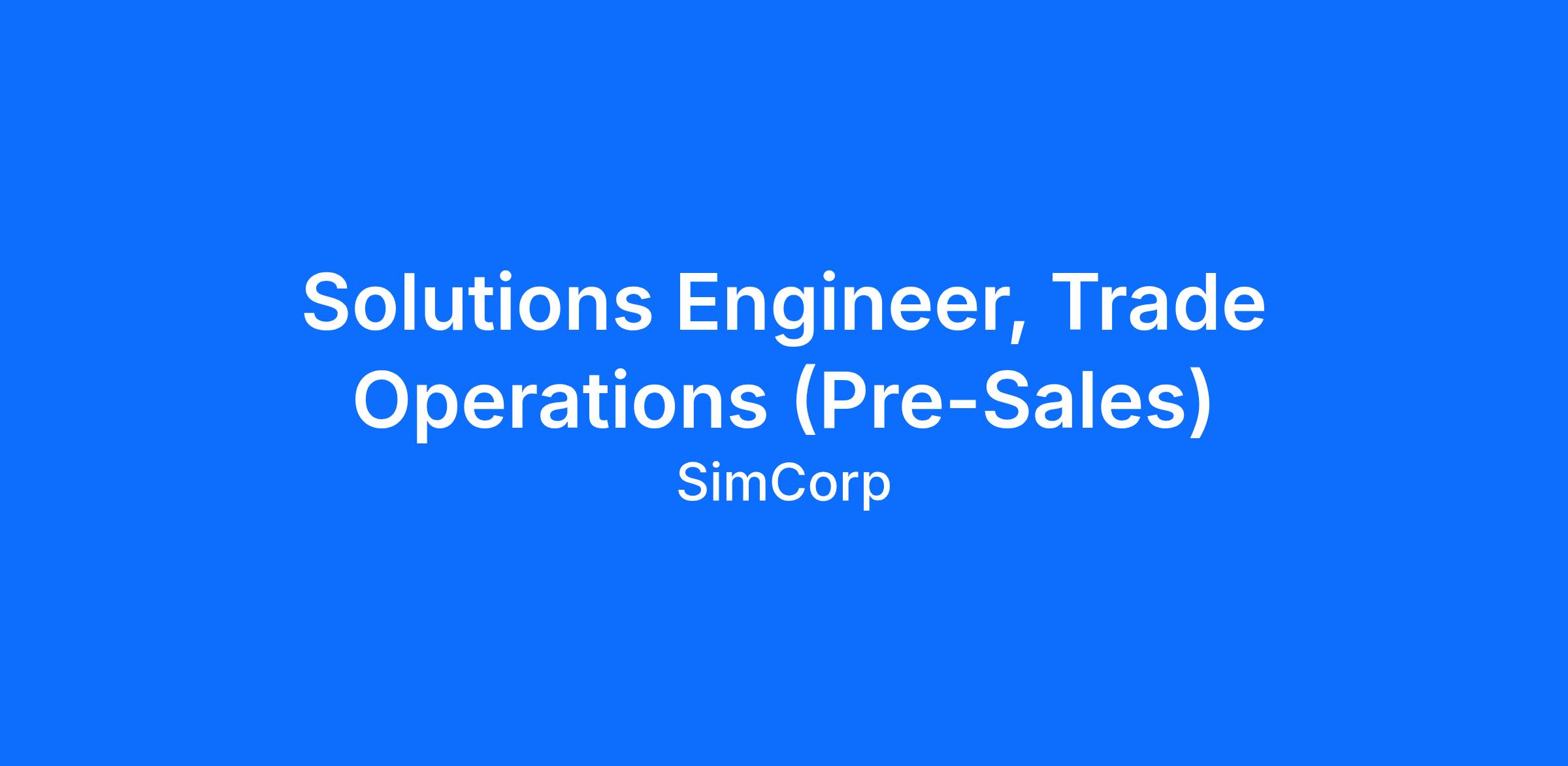 The Solutions Engineer plays a critical role in shaping SimCorp’s go-to-market, sales, and marketing initiatives to support revenue growth and expand SimCorp’s presence across the Americas. With a focus on Trade Operations workflows, this role helps articulate the value of SimCorp One to both prospective and existing clients. Working closely with Sales, Product, Customer Success and Implementation teams, the Solutions Engineer leads and coordinates client presentations and software demonstrations, ensuring SimCorp One’s capabilities are effectively showcased and aligned to client needs.