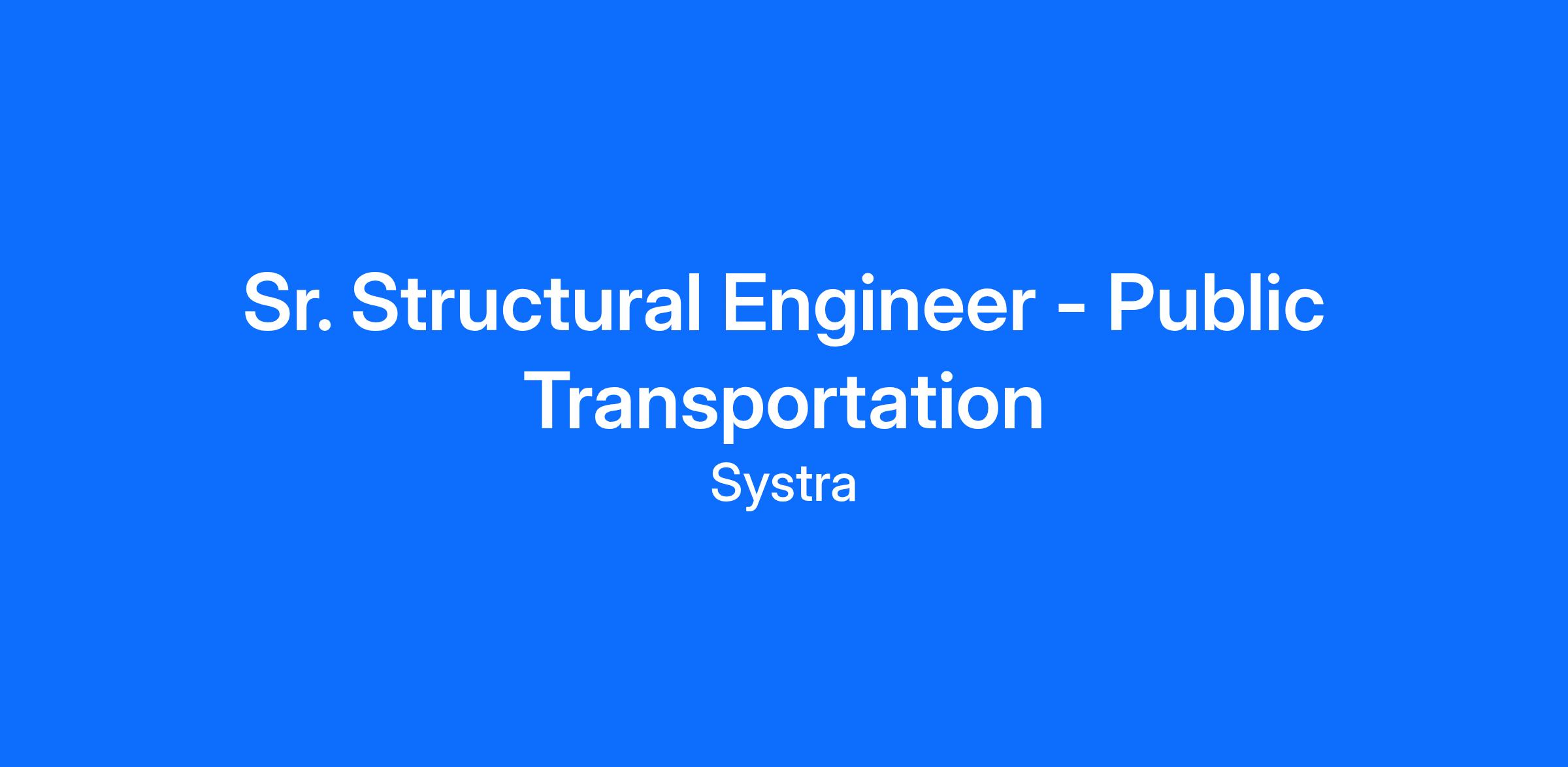 As a SYSTRA USA Sr. Structural Engineer, you will join a world-class team of high-performing engineers, designers, drafters and others who work collectively to ensure client projects continue to thrive while remaining on track and budget.