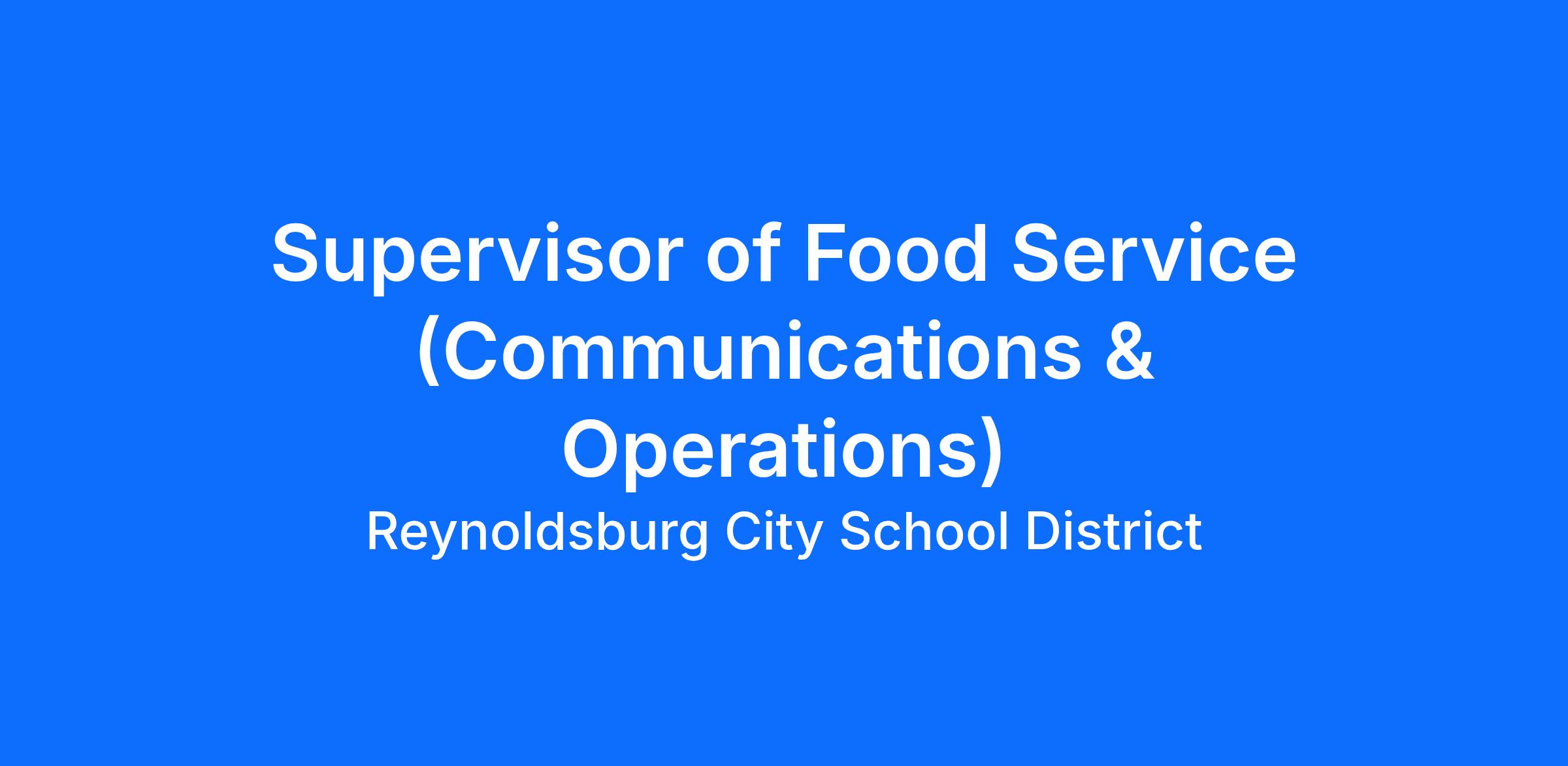 Primary Job Function: The Reynoldsburg City Schools’ Supervisor of Food Service (Communications & Operations) is responsible for serving as the Supervisor of Food Service under the direction of the Director of Food Service. The role performs a variety of duties in the Food Service office, including assisting in managing the food service program, managing communications with parents and community, managing marketing materials, and related duties as required.